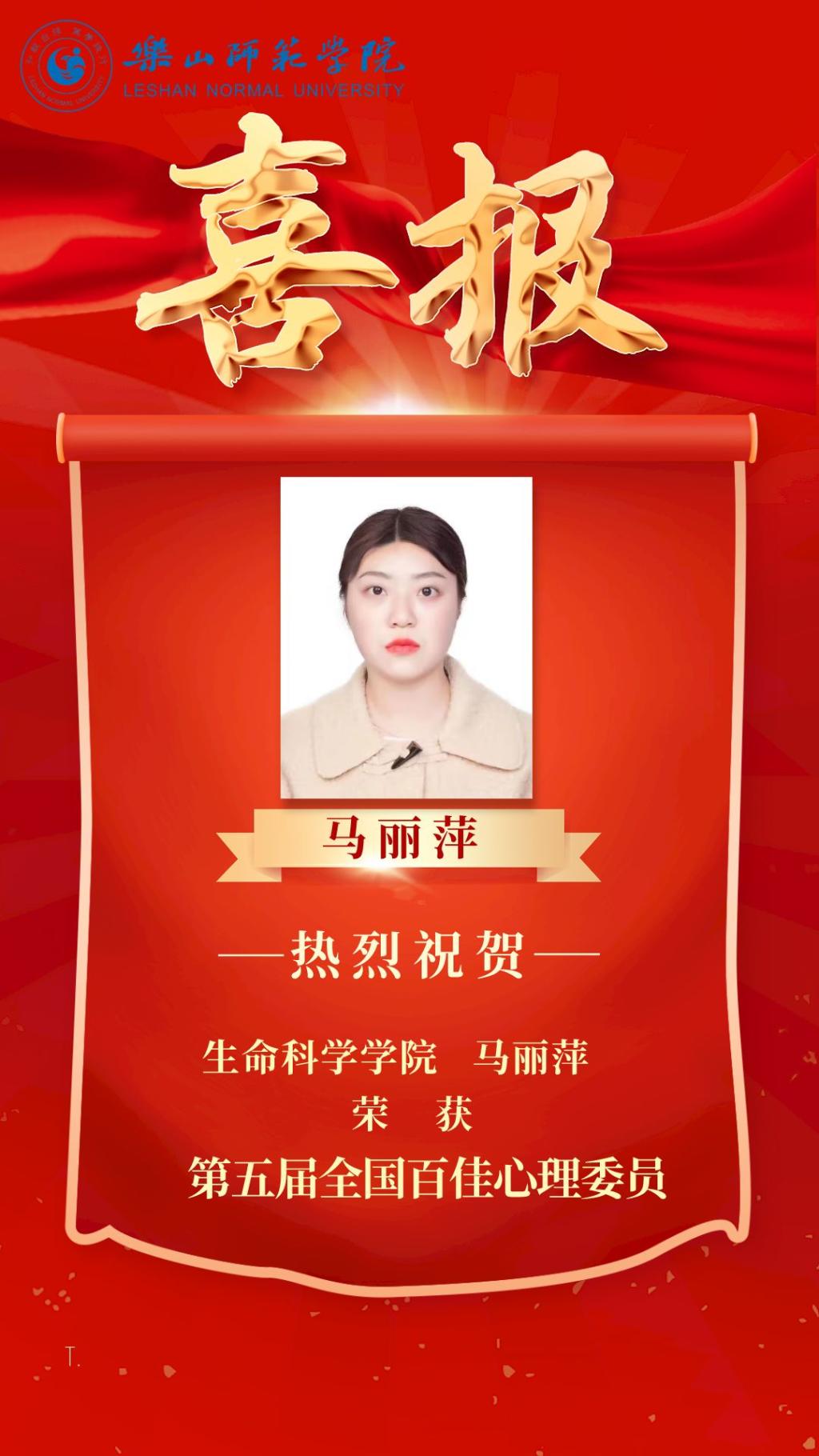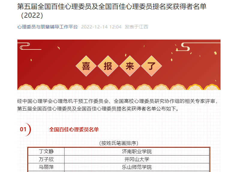 2019-2022年,共有4名心理委员荣获全国百佳心理委员,马丽萍同学作为朋辈心育工作者中的杰出代表,通过学校十佳心理委员评选,代表学校参选全国百佳心理委员评选并顺利当选,展示了乐师学子在心理健康教育工作中的高水平专业素养。