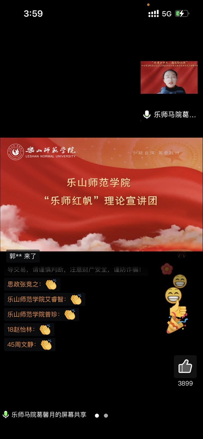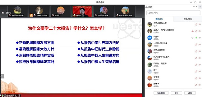 本网讯(文、图/黄潇亿)12月16日,受电子科技大学马克思主义学院邀请,“乐师红帆”宣讲团参加四川省高校马院联合举办的青年学子联学联讲党的二十大精神活动,本次宣讲采用腾讯会议方式开展,会议由电子科技大学马克思主义学院张贺森老师主持,我校马克思主义学院党委书记李涛、党委副书记钟永淑、辅导员张红丽、专任教师兼职辅导员何源与我院全体同学参加。