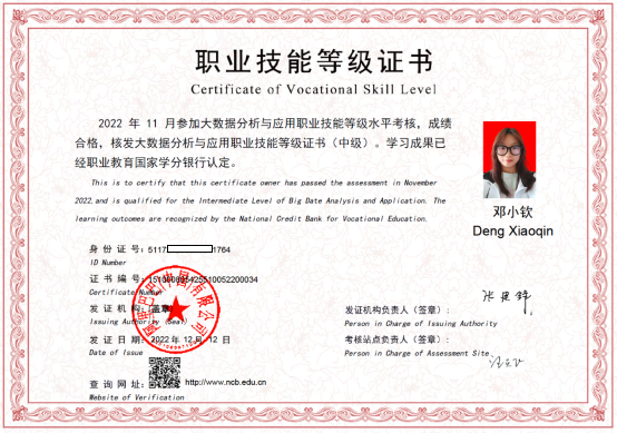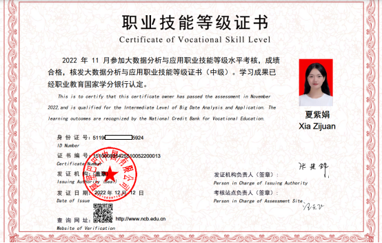 我院金融数学专业学生首次参加了2022年11月举办的“1+X”大数据分析与应用职业技能等级证书(中级)考试,包括金融数学专业学生邓小钦、夏紫娟、徐欣怡同学在内的共39名学生顺利通过考核,也于近日收到了等级证书。