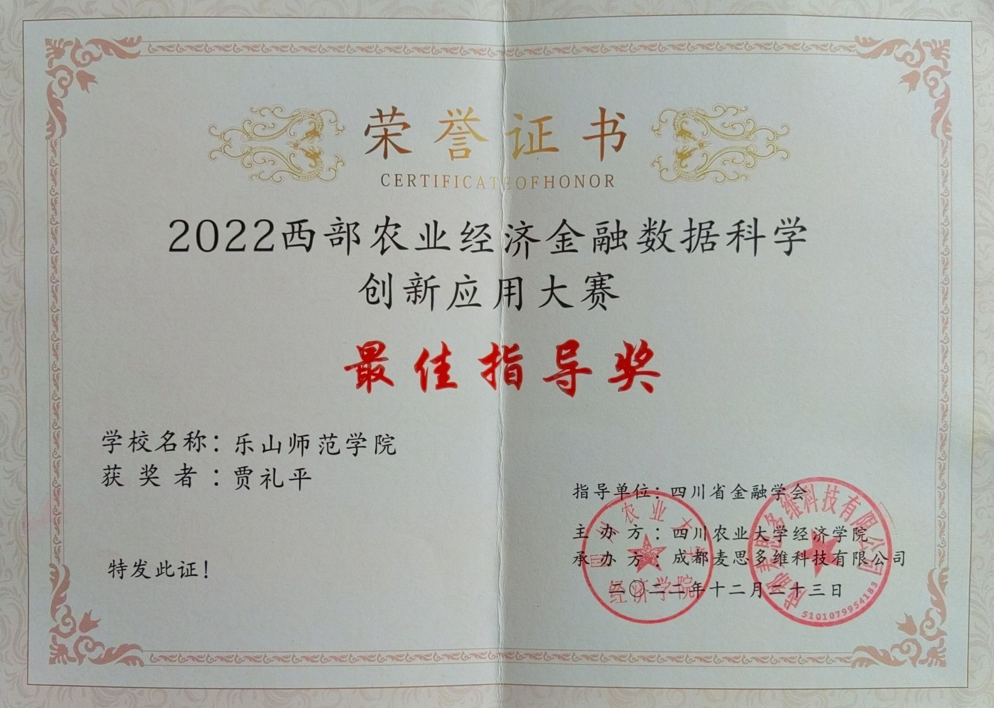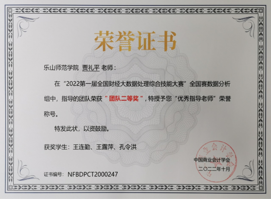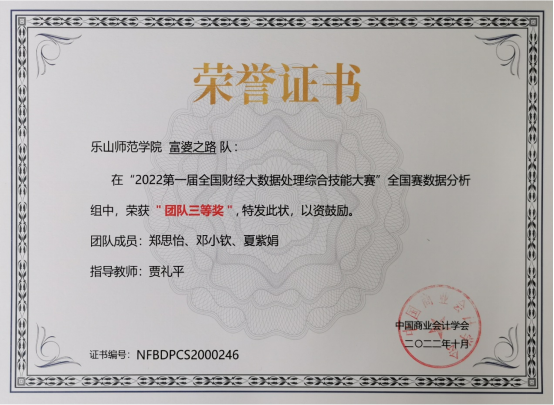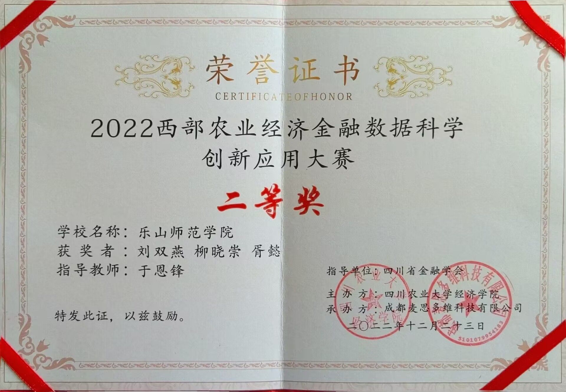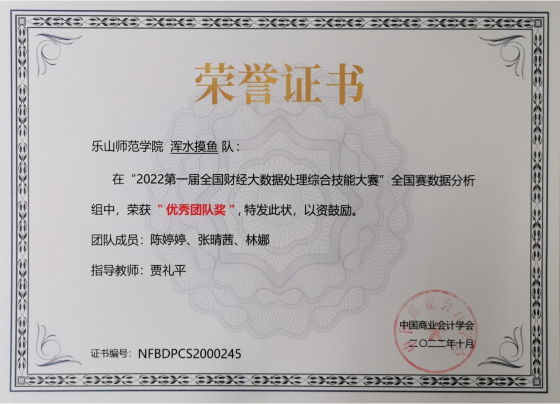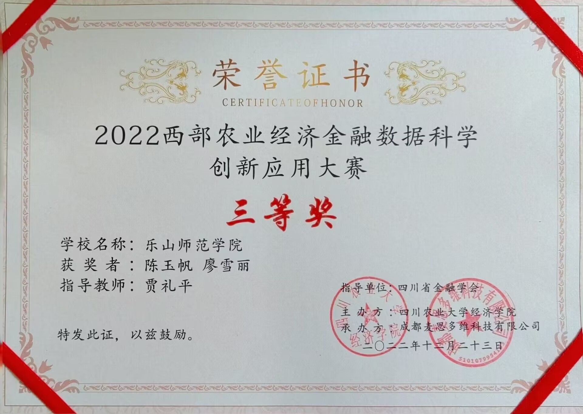 本网讯(文/于恩锋、图/贾礼平)2022年底我院学生参加的三项赛事今日颁发了获奖证书。其中,由四川省金融学会指导,四川农业大学主办,成都麦思多维科技有限公司承办的“2022西部农业经济金融数据科学创新应用大赛”,我院金融数学专业刘双燕组获得二等奖(二等奖设立2项),陈玉帆组、徐馨怡组获得三等奖(三等奖设立3项),贾礼平博士获得最佳指导奖。除此之外,获奖者还获得主办方奖励的500-1000元奖金。