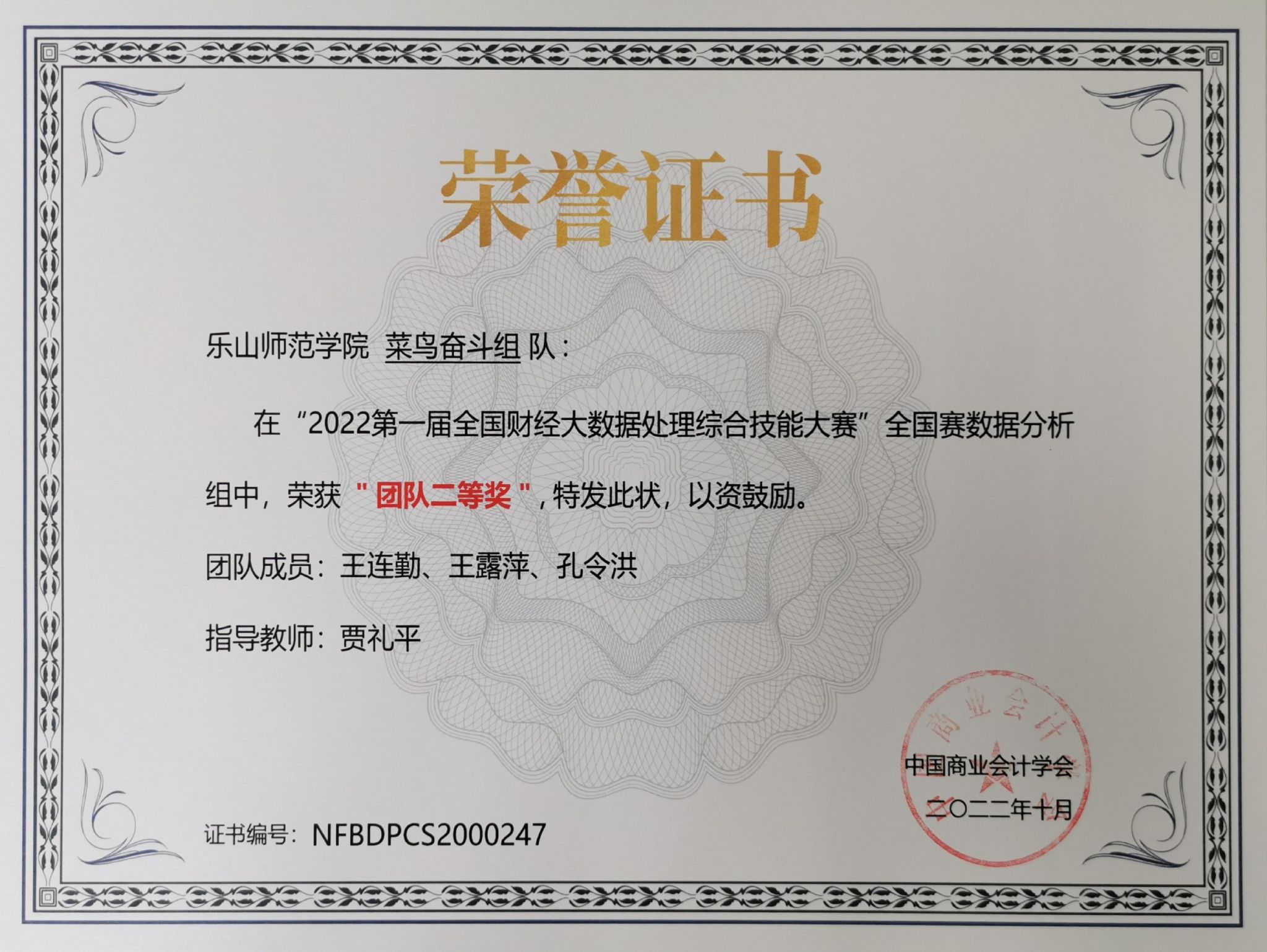 由中国商业会计学会主办,深圳希施玛数据科技有限公司等承办的“2022年第一届财经大数据处理综合技能大赛”也于今日颁发了获奖荣誉证书,王青组、陈婷婷组等6人获得优秀团队奖,郑思怡组3位同学获得团队三等奖,王连勤组3位同学获得团队二等奖,指导教师贾礼平博士获得优秀指导教师奖。