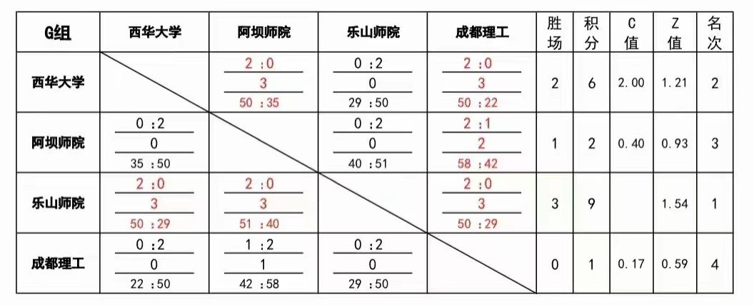 乐山师范学院女子排球队由体育学院院长张峰担任领队、苏围萍、李蜀伟老师担任教练,率领12名队员参加了本次比赛。小组赛中,乐山师范学院女子排球队以三个2:0先后战胜阿坝师范学校、成都理工大学、西华大学,以小组第一名的成绩出线;在第二阶段淘汰赛对手为四川农业大学,我校女排在先失一局的情况下,连胜两局,逆转获胜,特别是在决胜局面对9:12的落后局面,教练员沉着指挥、运动员顽强拼搏,以15:13取得最后的胜利,挺进总决赛。