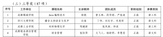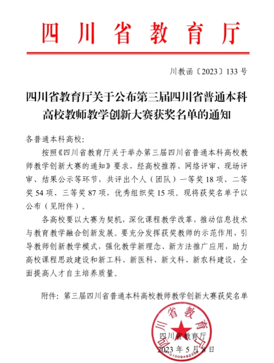 本网讯(文、图/代丽)5月9日,四川省教育厅公布了第三届四川省普通本科高校教师教学创新大赛获奖名单,我校黄宽娜、方德静、张立3名教师(团队)分别获得正高组、副高组、中级及以下组三等奖。