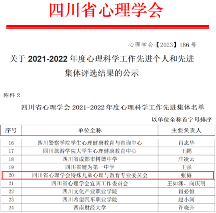 本网讯(文/杨燕 图/刘宗泉) 近日,四川省心理学会发布了《关于2021-2022年度心理科学工作先进个人和先进集体评选结果的公示》(心理学会〔2023〕186号),依托我校建设、由我校特殊教育学院作为主任单位的四川省心理学会特殊儿童心理与教育专业委员会获“四川省心理学会2021-2022年度心理科学工作先进集体”。