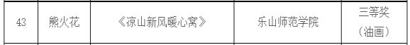 本网讯(文、图/曾伟平 熊火花)根据《四川省文化和旅游厅四川省人力资源和社会保障厅关于开展2023年四川文华奖和群星奖评选表彰工作的通知》、《四川文华奖章程》和《四川文华奖美术奖评奖办法》的规定,经专家严格评审,评选出拟作为第三届四川艺术节四川文华奖美术奖表彰作品95件,其中,一等奖15件、二等奖30件、三等奖50件,另评选出423件优秀作品拟作为第三届四川艺术节四川文华奖美术奖优秀作品展入展作品。我校美术与设计学院副院长熊火花油画作品《凉山新风暖心窝》获评三等奖,曾伟平老师国画作品《四川彝族赶圩上》获评优秀作品,书法学专业2021级学生陈一博的篆刻作品《叙堂治印留痕》获评优秀作品。