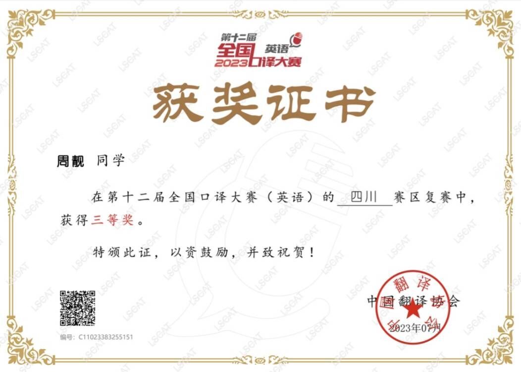 本网讯(文/王林 图/周靓)近日,第十二届全国口译大赛(英语)结果揭晓,外国语学院翻译专业2020级学生周靓荣获省赛三等奖。