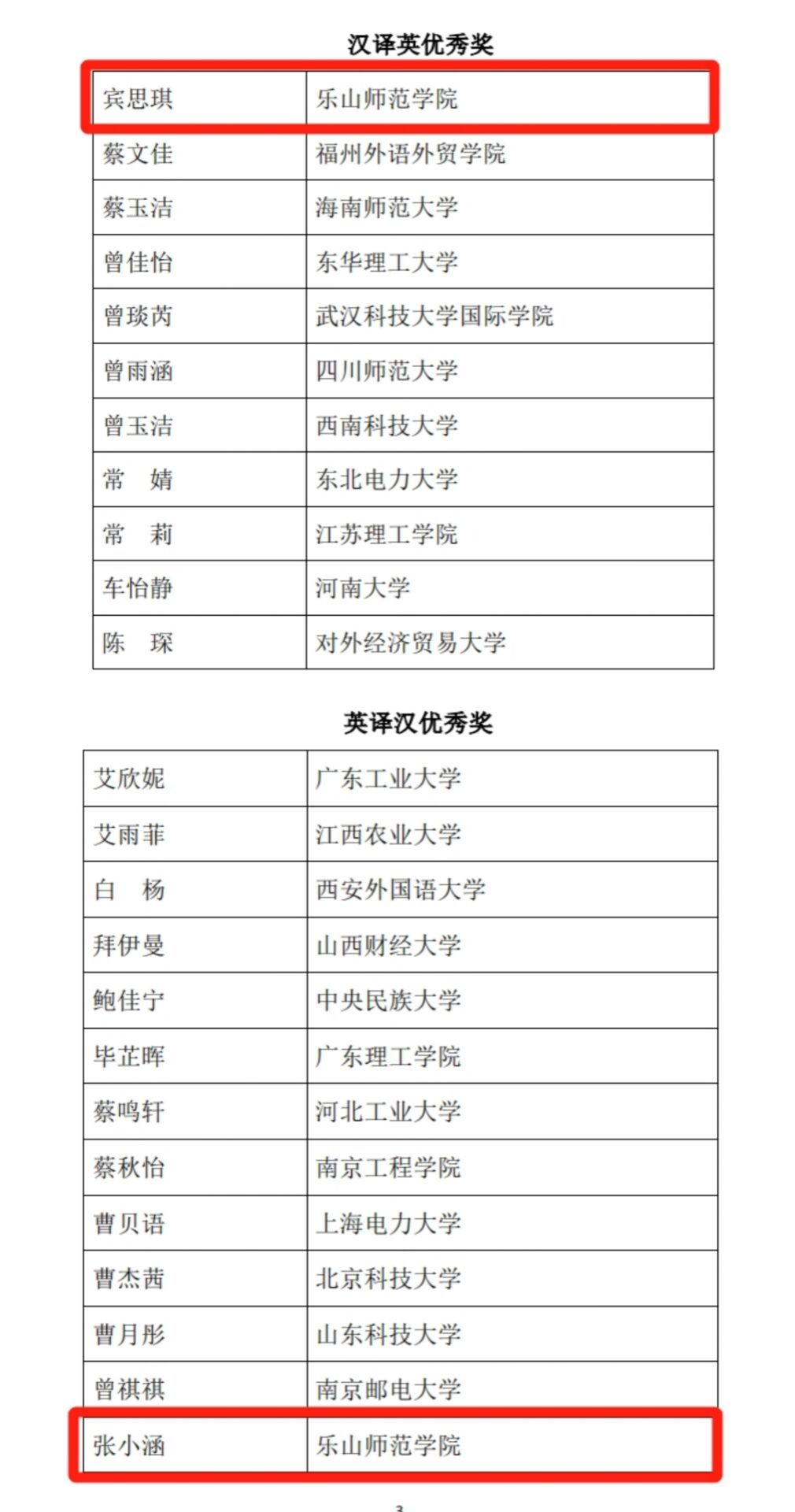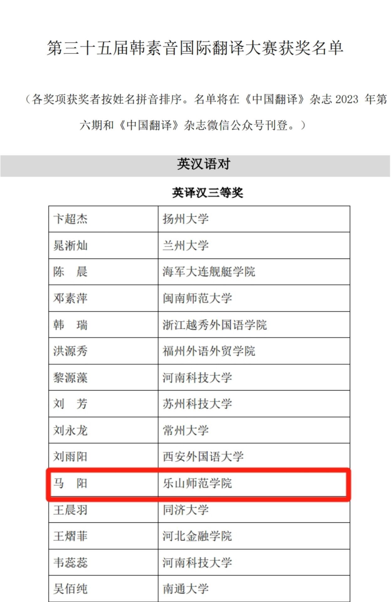 本网讯(文、图/王林)10月17日,第三十五届韩素音国际翻译大赛揭晓获奖名单。我校外国语学院英语专业2021级马阳获英译汉三等奖、翻译专业2022级张小涵获英译汉优秀奖、英语专业2022级宾思琪获汉译英优秀奖,系外国语学院在该项赛事取得的最佳成绩。