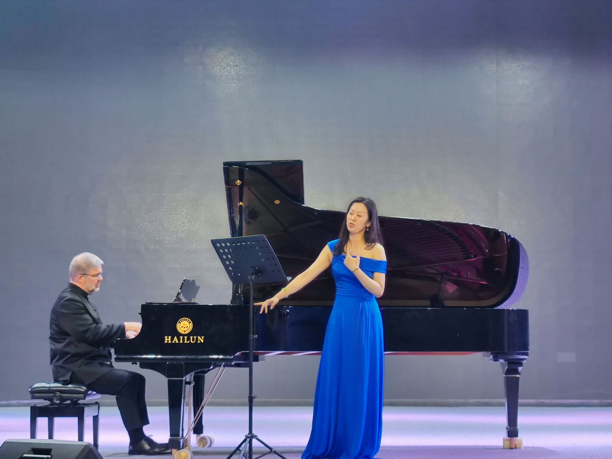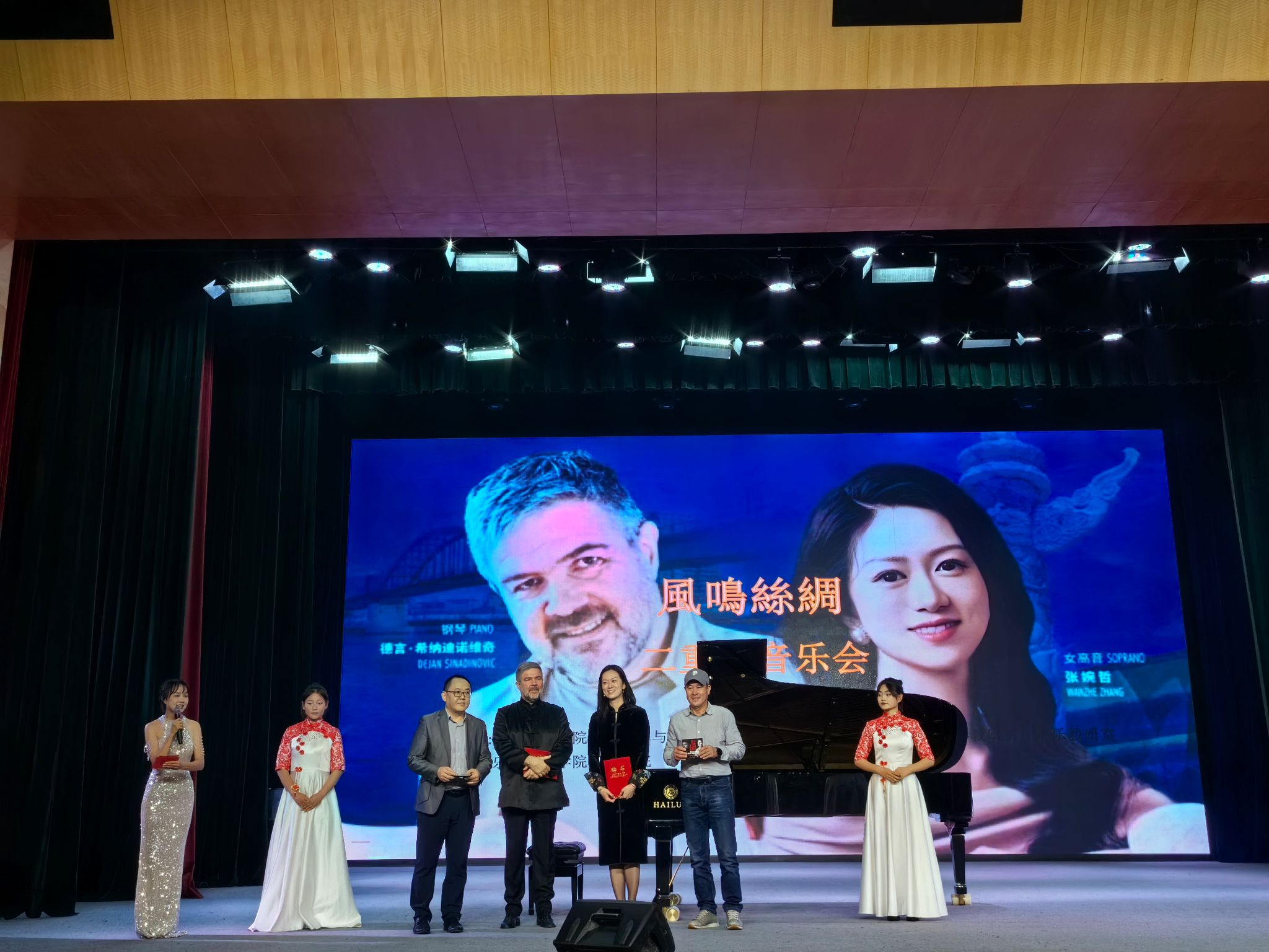 本网讯(文、图/李云昆)10月25日晚上19:30分,一场盛大的音乐会在实训大楼多功能厅隆重上演。本次音乐会由音乐学院主办,音乐会邀请到了塞尔维亚籍著名钢琴家德言·希纳迪诺维奇教授和中国旅美女高音歌唱家张婉哲女士,并为全体师生带来了一场极致的视听盛宴。