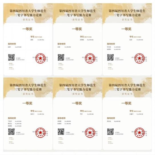 本网讯(文/陈怡洁,图/胡涛)乘风破浪夺佳绩,披荆斩棘勇争辉。在刚结束的第四届四川省大学生师范生“三笔字”书写能力竞赛中,我校学子获得专业组一等奖2项、二等奖2项、三等奖4项,非专业组一等奖4项,二等奖8项、三等奖11项,周文斌、武涛、吴胜景、辛纪者等教师荣获省赛优秀指导教师。