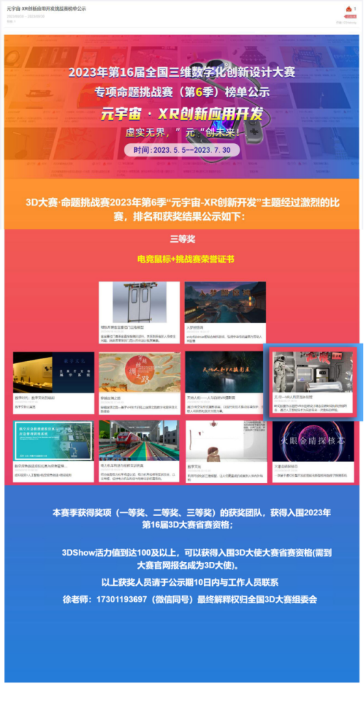 其中数字人居设计赛道王华清教授指导的环艺设计专业肖乾镱、徐炳妍、陈雪倩和李雨露团队作品《无尽》获得了特等奖,并进入国赛资格,并且该作品在2023年5月至7月底,3D大赛-命题挑战赛第6季“元宇宙-XR创新开发” 主题命题挑战赛中获得全国三等奖。