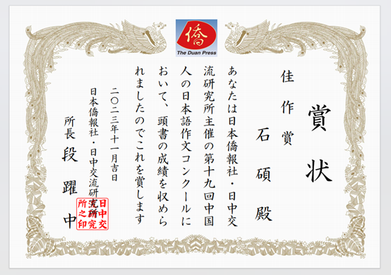 11月中旬,第19届中国人日语作文大赛落下帷幕,我校日语专业2021级学生石硕在刘紫英老师的悉心指导下,获得佳作奖。2023年5月大赛征稿启事发布后,我院日语系老师组织并指导学生们积极写稿参赛。第19届“中国人日语作文大赛”以“中日和平友好条约缔结45周年”为大赛主题。据统计,参赛者遍布全国28个省市自治区的大学、研究生院等155所学校,共计2376部参赛作品。通过评审的数次严格审查,从参赛作品中选出了最优秀奖(日本大使奖)(1名)、一等奖(5名)、二等奖(15名)、三等奖(40名)、佳作奖(约100名)。