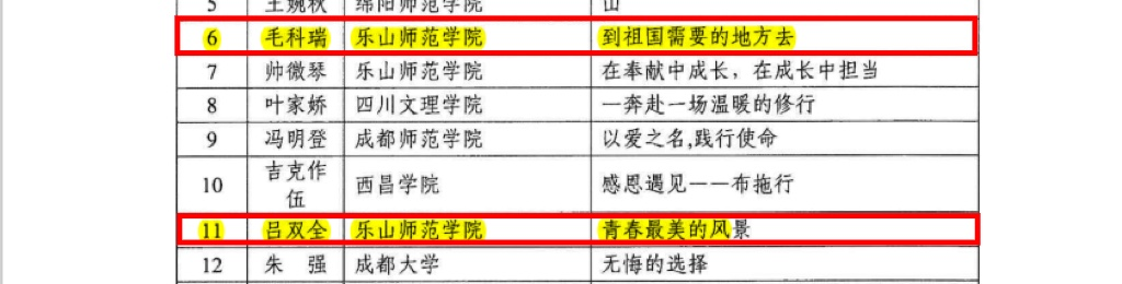 本网讯(文、图/郑新美)近日,由四川省教育厅、四川省关心下一代工作委员会共同举办的“爱在大凉山”师范生顶岗实习凉山支教活动征文比赛结果公布。数理学院师生踊跃参与,喜获佳绩,分布荣获团队一等奖1项、二等奖1项,个人三等奖1项、优秀奖7项。