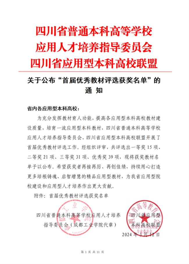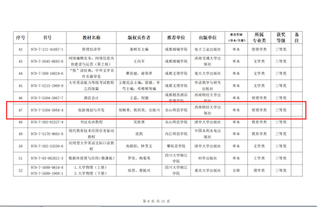 本网讯(文、图/郑柳青)近日,四川省普通本科高等学校应用人才培养指导委员会、四川省应用型本科高校联盟公布了首届优秀教材评选获奖名单。旅游与地理科学学院郑柳青、郭剑英、方海川主编的教材《旅游规划与开发》(西南财经大学出版社,2022年1月出版)荣获三等奖。