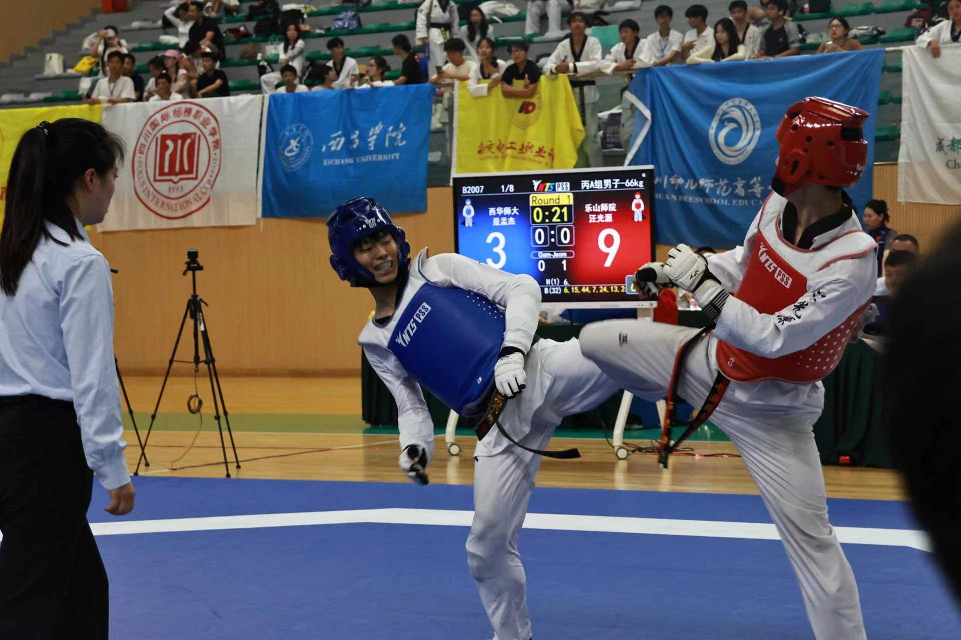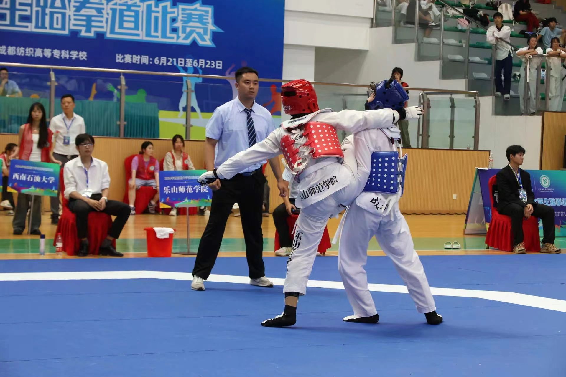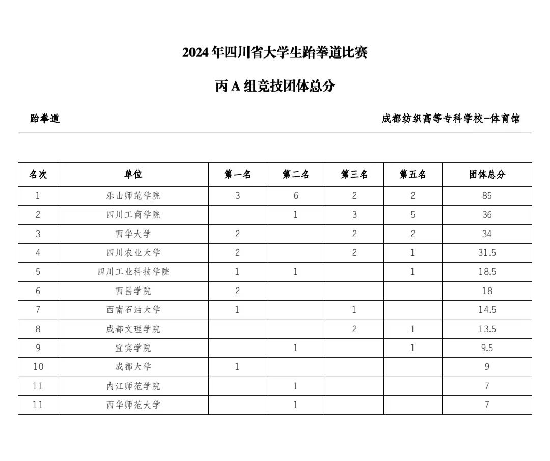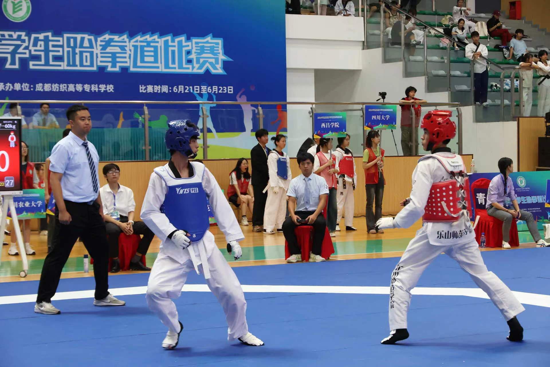本网讯(图、文/曾祥义)2024年6月21日至24日,由四川省教育厅、四川省体育局共同发文,四川省大学生体育协会主办的“2024年四川省大学生跆拳道比赛”在成都纺织专科学校犀浦校区体育馆举行,本次比赛按国家级赛事规格和要求执行,来自全省36所高校的420名运动员参加了本次比赛。我校跆拳道代表队由张爱平副院长担任领队,曾祥义、石曼曼、杨文铭三位老师担任教练,带领28名运动员参加了甲组(本科非体育专业)和丙A组(体育专业本科组)的比赛。