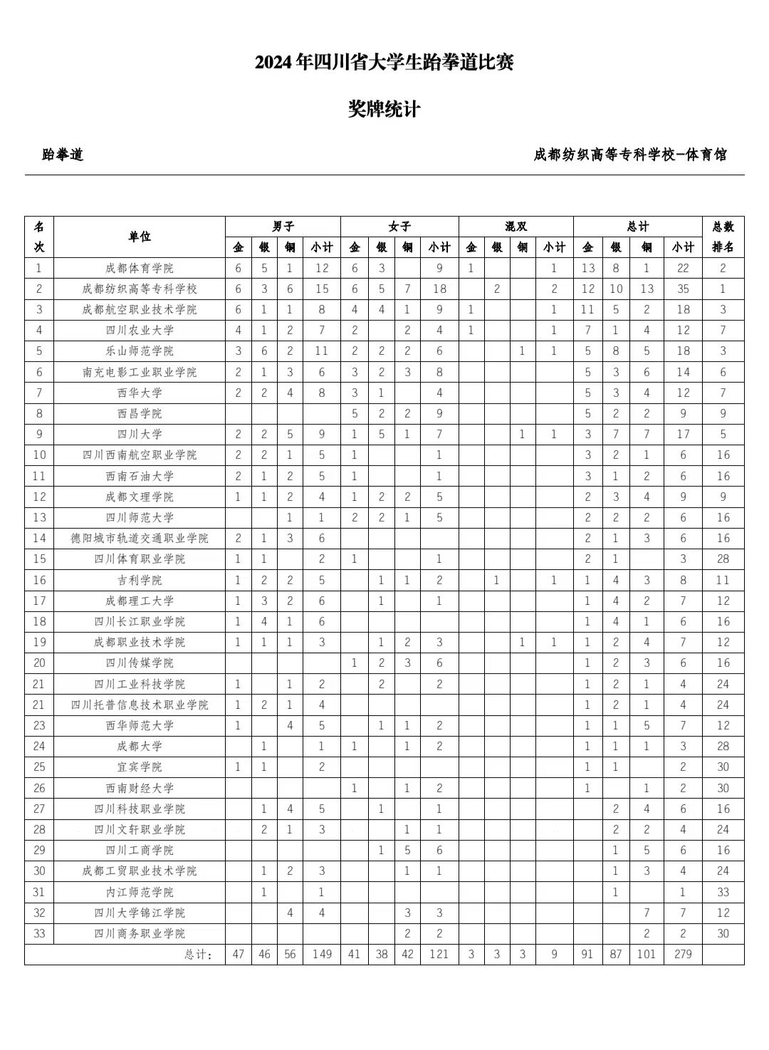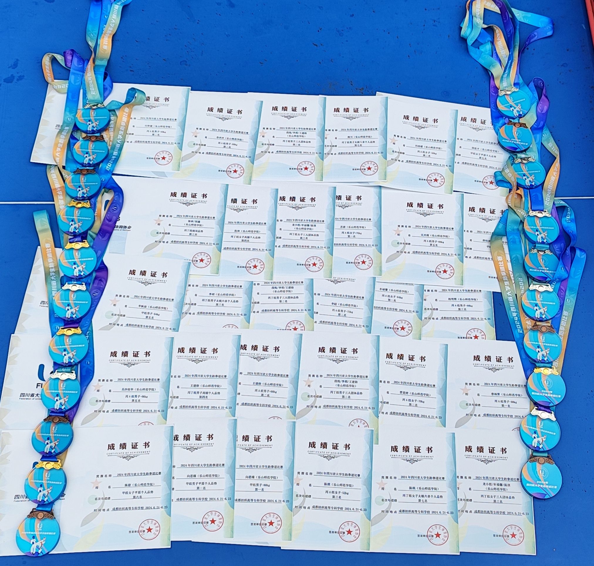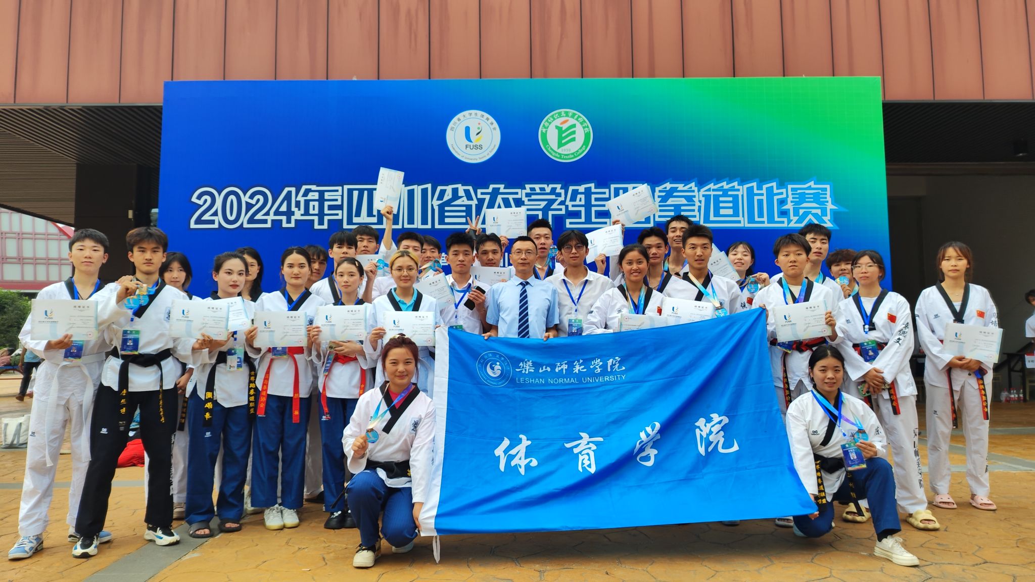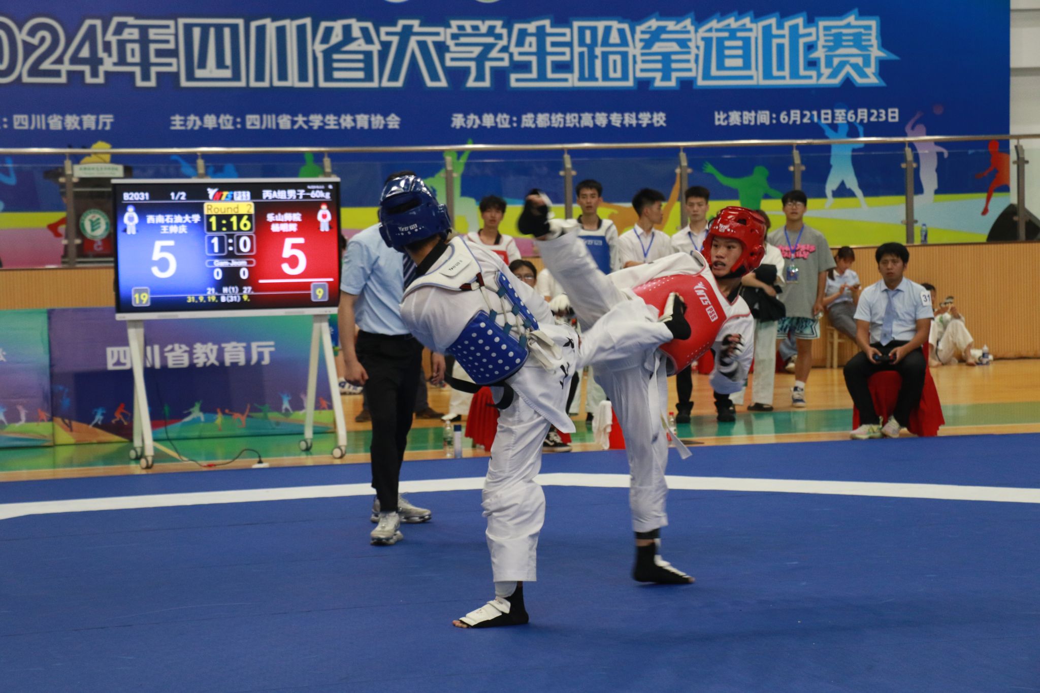 本网讯(图、文/曾祥义)2024年6月21日至24日,由四川省教育厅、四川省体育局共同发文,四川省大学生体育协会主办的“2024年四川省大学生跆拳道比赛”在成都纺织专科学校犀浦校区体育馆举行,本次比赛按国家级赛事规格和要求执行,来自全省36所高校的420名运动员参加了本次比赛。我校跆拳道代表队由张爱平副院长担任领队,曾祥义、石曼曼、杨文铭三位老师担任教练,带领28名运动员参加了甲组(本科非体育专业)和丙A组(体育专业本科组)的比赛。