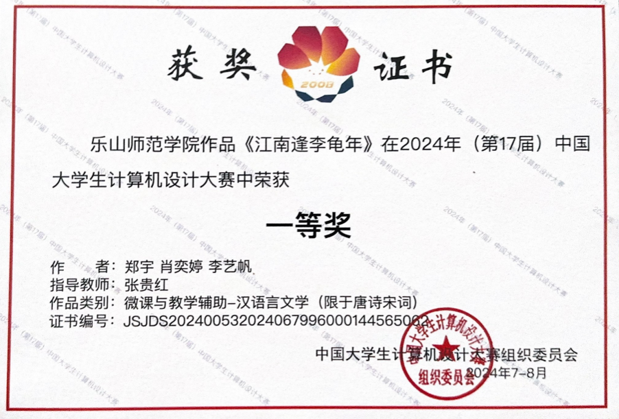 在本次大赛中,由电子信息与人工智能学院张贵红老师指导,2022级教育科学学院郑宇、肖奕婷同学及2022级马克思主义学院李艺帆同学共同研发的《江南逢李龟年》微课作品脱颖而出,荣获“微课与教学辅助”赛道全国一等奖。这一佳绩不仅彰显了该团队的创新能力和专业水平,也体现了学校在培养创新型人才方面的卓越成效。