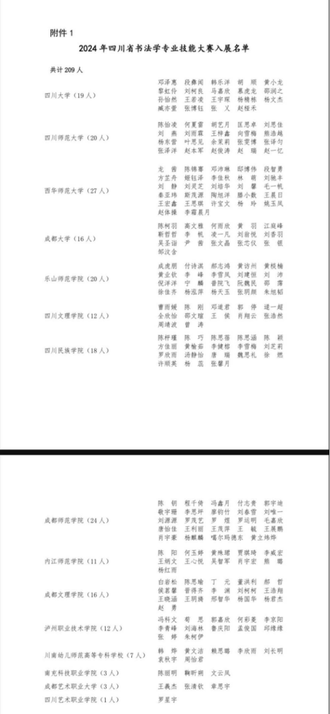 本网讯(文图/刘善军)近期四川省书法学专业技能大赛评审结果揭晓。我校书法学专业学生在此次比赛中表现优异,共有20幅作品成功入展,在全省同类院校排名第三。本次比赛吸引了全省15所高校的书法学专业学生参与,共有209名同学入展。