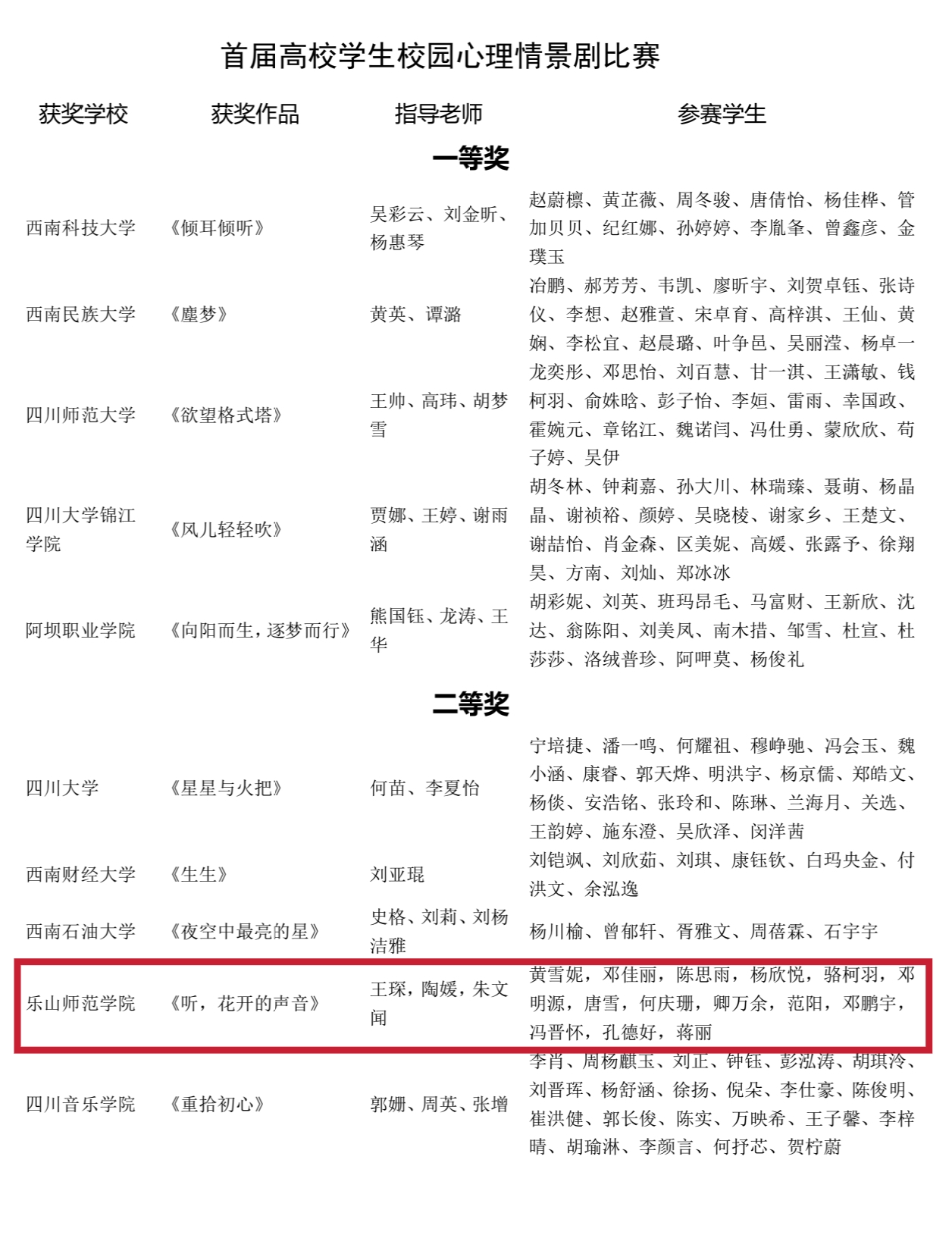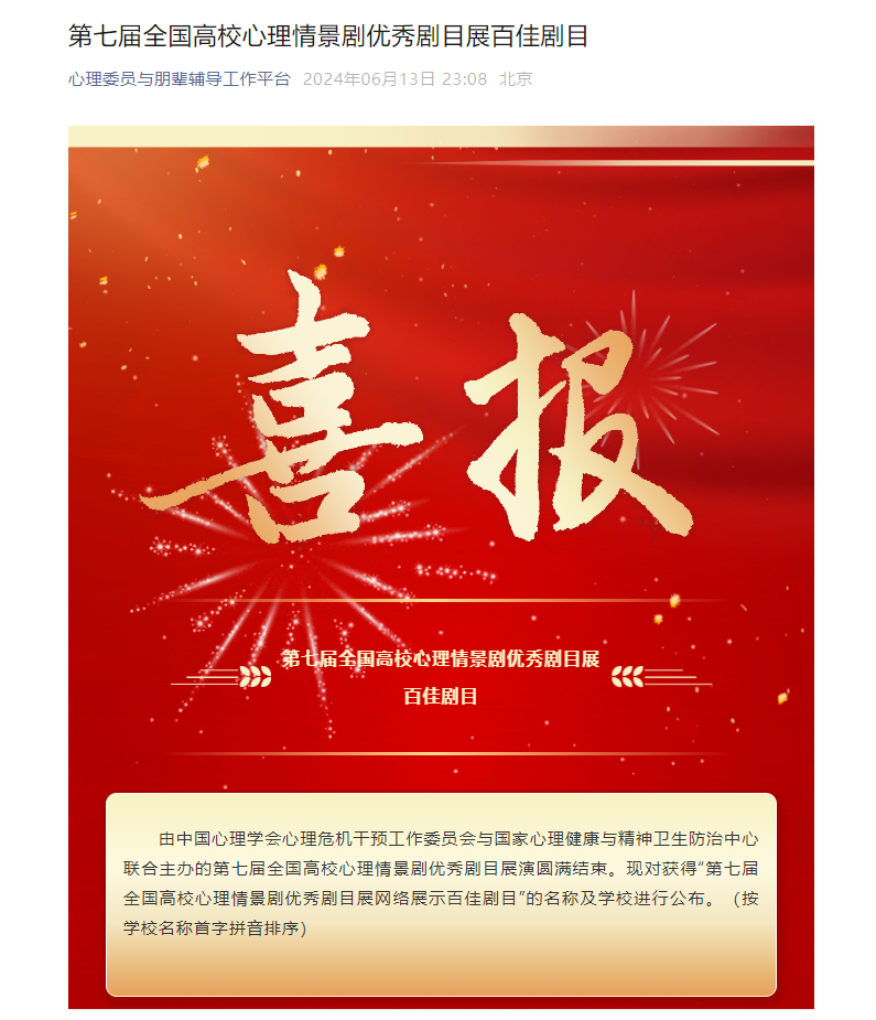 由我校教师王琛、陶媛和朱文闻指导、特殊教育学院学生陈思雨等参演的作品《听,花开的声音》获首届高校学生校园心理情景剧比赛二等奖,同时,该作品于今年六月获评第七届全国高校心理情景剧优秀剧目展百佳剧目;心理健康教育中心专职教师朱文闻的视频作品——《人际交往中的心理效应》获得首届高校心理健康心理知识科普视频比赛三等奖;教育科学学院王锐茜、特殊教育学院杨宝儿在首届高校学生心理知识比赛中获奖。