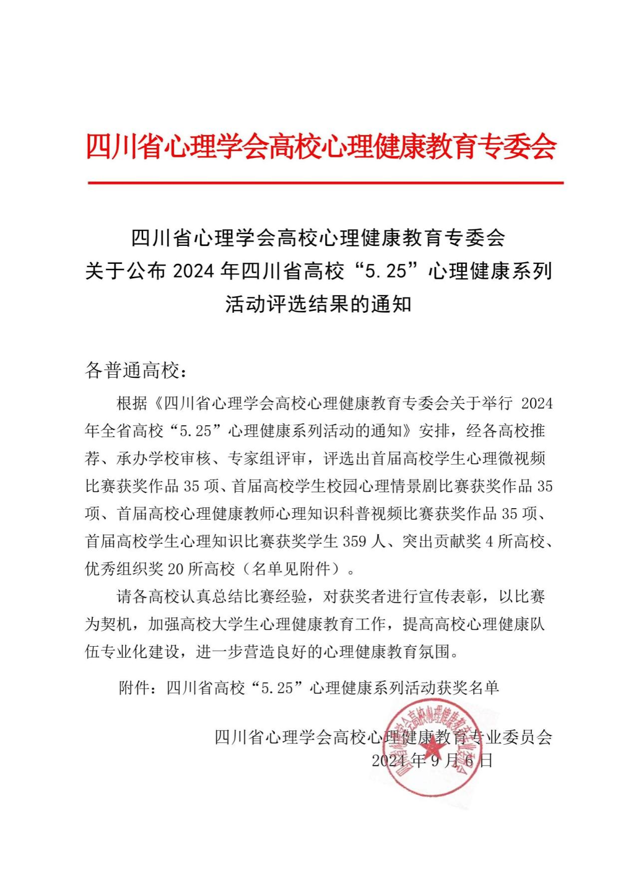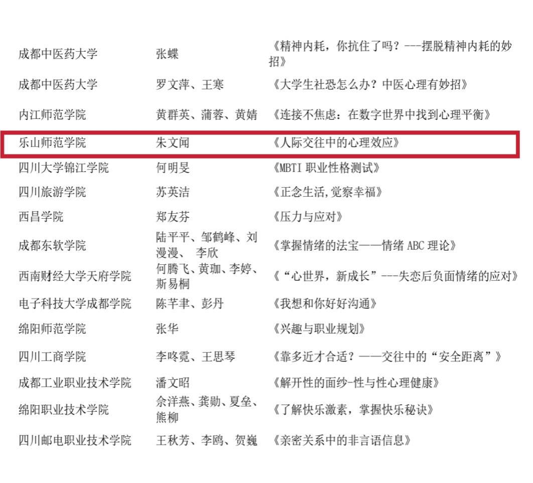 近日,四川省心理学会高校心理健康教育专业委员会公布了2024年四川省高校“5.25”心理健康系列活动评选获奖名单,我校2项作品、2名学生在2024年四川省高校“5.25”心理健康系列活动中获奖。
