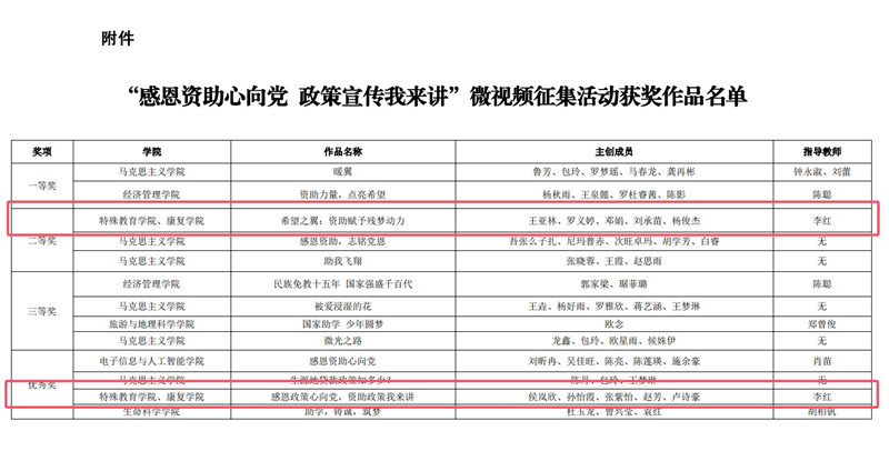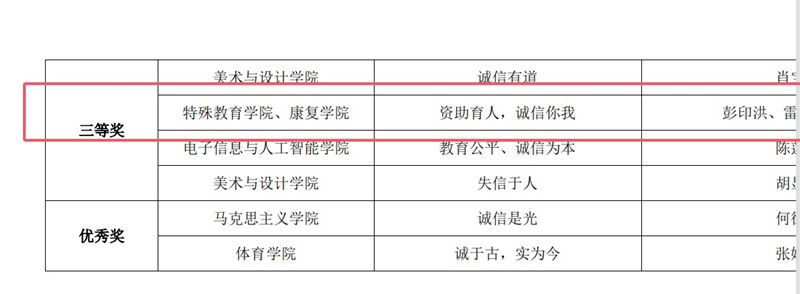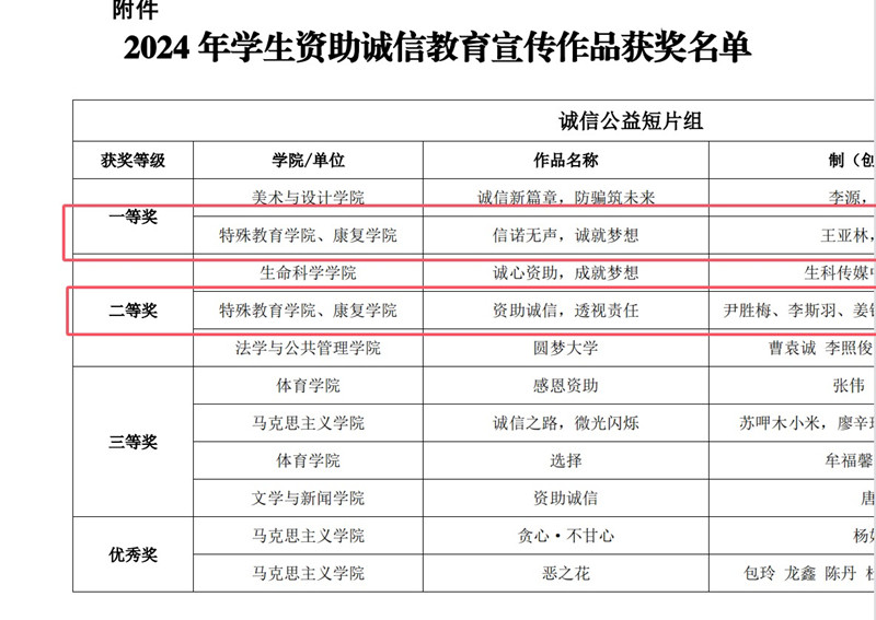 本网讯(文图/王亚林)我校2024年学生资助诚信教育宣传作品评选活动中,特殊教育学院表现卓越,荣获多项大奖,彰显了学院在诚信教育方面的深厚底蕴与不懈努力。此次获奖不仅是对学院师生创作才华的认可,更是对学院长期以来在诚信教育方面所采取的一系列创新措施与显著成效的肯定。