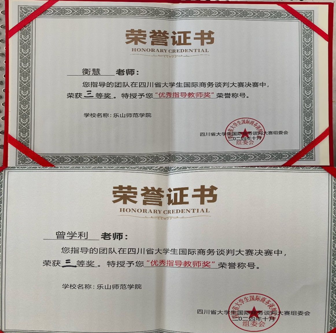 本网讯(文、图/曾学利)近日,首届四川省大学生国际商务谈判大赛在西南财经大学隆重举行,我校外国语学院商务英语专业两只代表队伍披荆斩棘,在决赛中荣获三等奖;曾学利老师应邀担任大赛评委,衡慧、曾学利两位指导老师获得“优秀指导老师”称号。