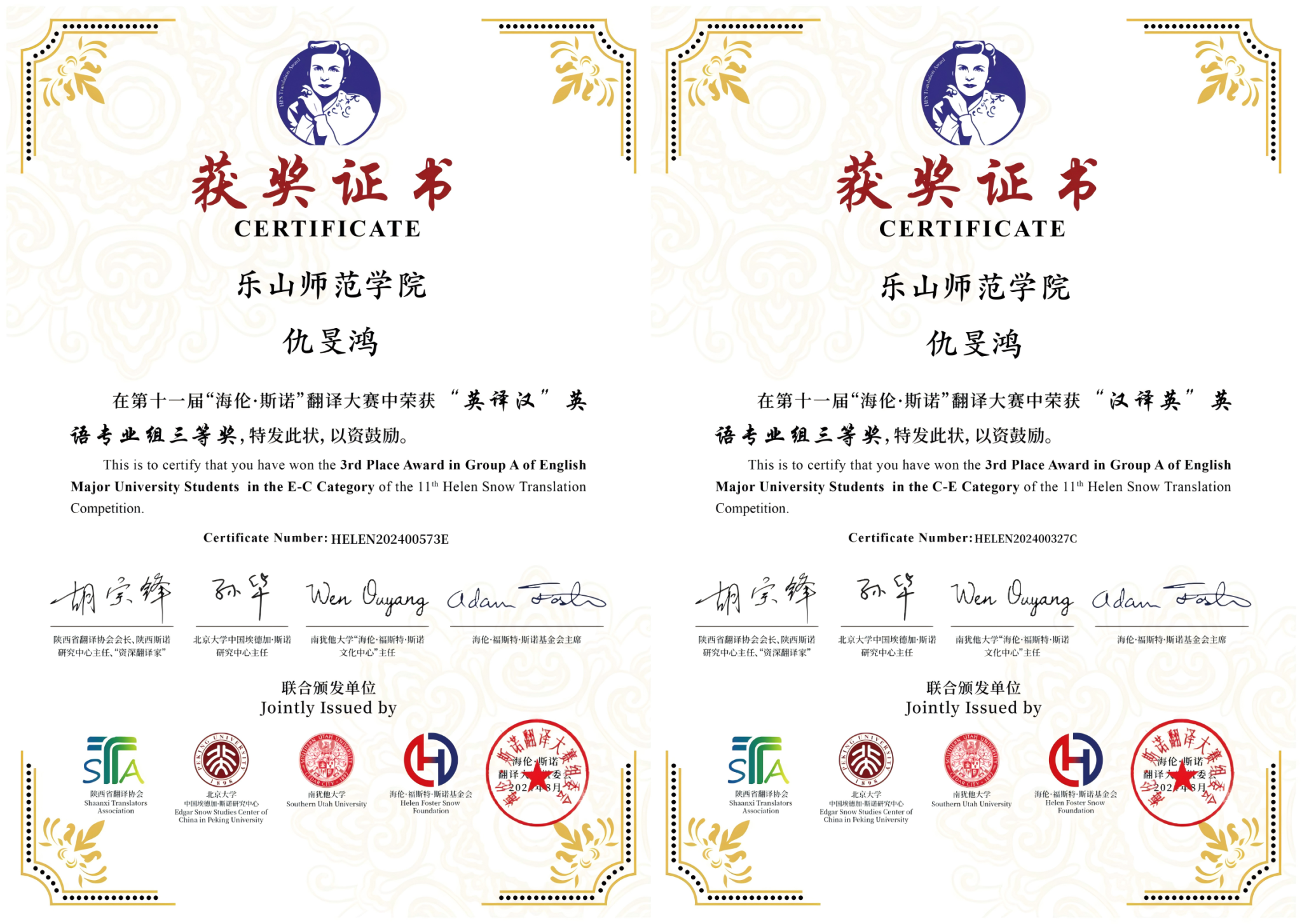 本网讯(文、图/仇旻鸿、张小涵)近日,四项翻译大赛公布结果,外国语学院学生在翻译教学团队的指导下取得佳绩。仇旻鸿在第十一届“海伦·斯诺”翻译大赛中获得英译汉组和汉译英组三等奖;在第三届“新·榕城杯”翻译技能大赛中获得英语组和日语组三等奖;在首届游戏翻译本地化与国际化大赛中获得优秀奖。张小涵、王泽阳、叶子毓、张一佳在第二届“译成都”全国大学生英语翻译大赛获得三等奖。