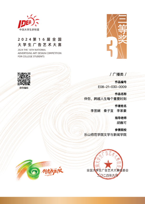 本网讯(文图/姜壮)11月23日,第16届全国大学生广告艺术大赛学科竞赛成果展示盛典在北京隆重举行,乐山师范学院文学与新闻学院的学子们在第十六届全国大学生广告艺术大赛中再次展现了扎实的创意和专业能力,连续第八年获得国家级奖项,体现了文新学院在新闻与媒体传播、广告艺术教育领域的稳健发展和持续进步。