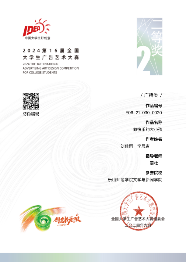 由播音与主持艺术专业刘佳雨和李晟吉同学创作,姜壮老师指导的广播类《做快乐的大小孩》荣获二等奖,该作品以其独特的视角和深刻的内涵,赢得了评委的高度认可。另一件作品《伴你,跨越人生每个重要时刻》由播主专业的李昱娴、秦子宜和李家豪,胡巍可老师指导,获得国家三等奖,展现了学生们对生活细节的敏锐洞察和艺术表达的高超技巧。