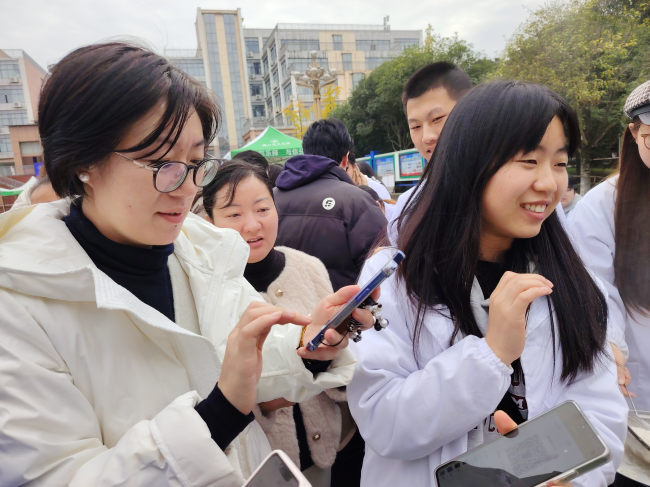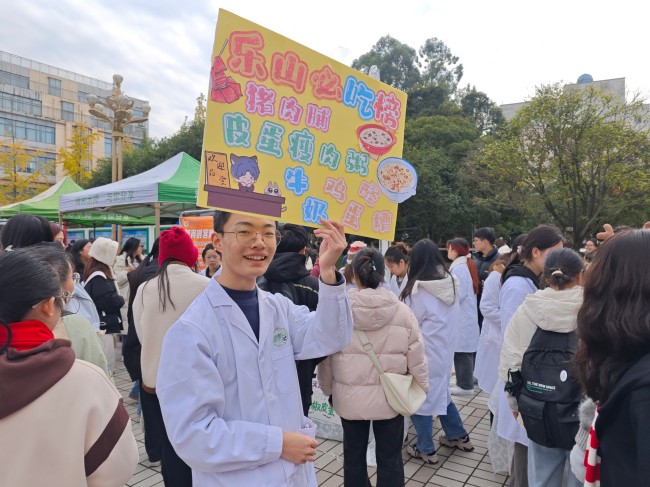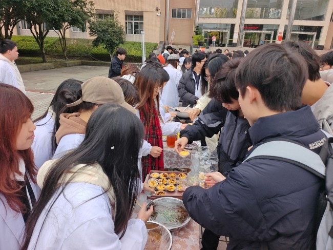 集市受到了广大同学的热烈欢迎,热腾腾的馄饨、精致可口的蛋黄酥、麻辣鲜香的椒香翡翠蛋....大量学生驻足品尝并争相购买,现场气氛热闹非凡。