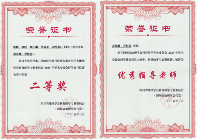 本网讯(文/徐妍,图/魏薇)3月29日,由四川省地理学会科普研学专业委员会主办的研学旅行设计大赛在绵阳师范学院圆满落幕。由我校旅游与地理科学学院徐妍、张欣、周小琳、李雨生、木呷布日5名同学组成的团队在比赛中表现出色,斩获二等奖,指导教师孟凡帅、乔恒忠荣获“优秀指导老师”奖。