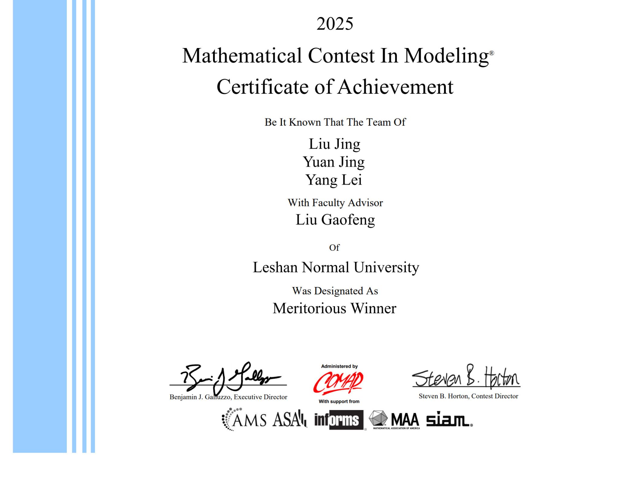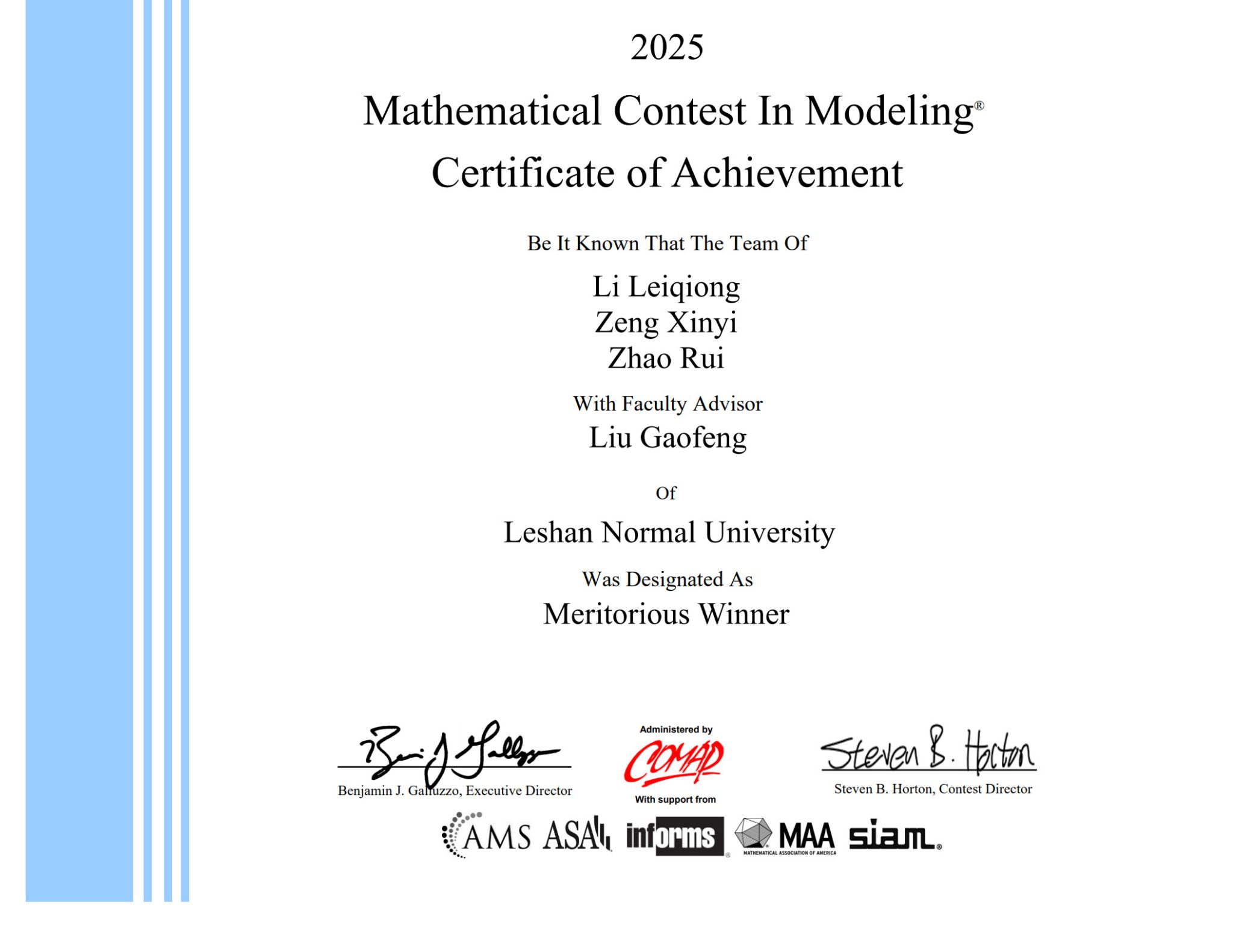 本网讯(文、图/刘高峰、赵太燕)近日,2025年美国大学生数学建模竞赛(MCM/ICM)成绩公布,乐山师范学院数理学院共有25支队伍参赛,共获得3项M奖、5项H奖和17项S奖的优异成绩,在获奖数量上创近几年新高。