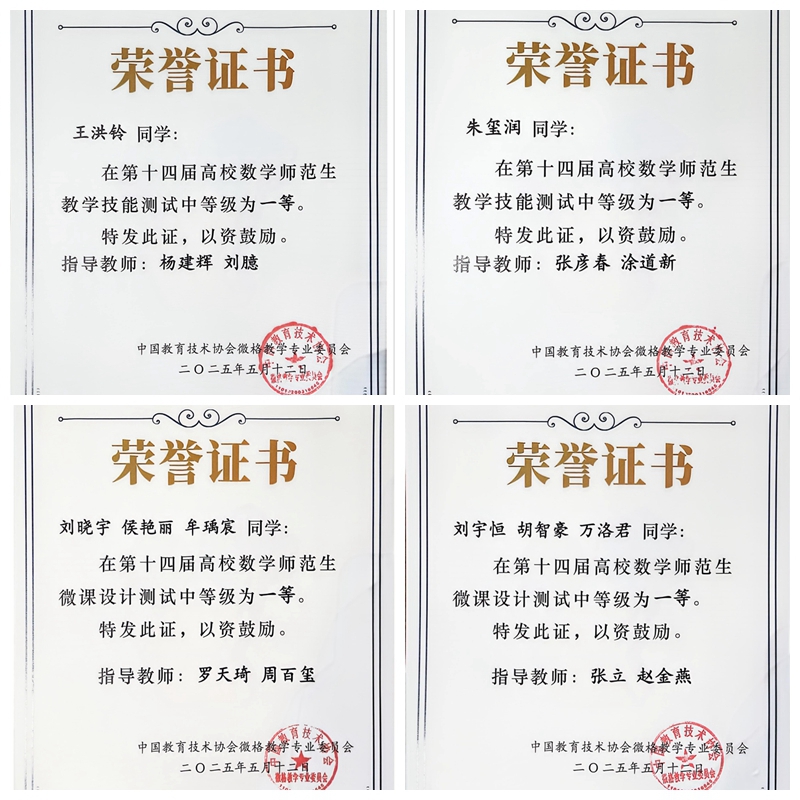 本网讯(文/朱玺润、图/黄婉茹)近日,数理学院朱玺润等18名同学分别以组队赛、个人赛方式参加了第十四届高校数学师范生微课设计与微格教学技能测试与交流展示两项比赛,并喜获佳绩。