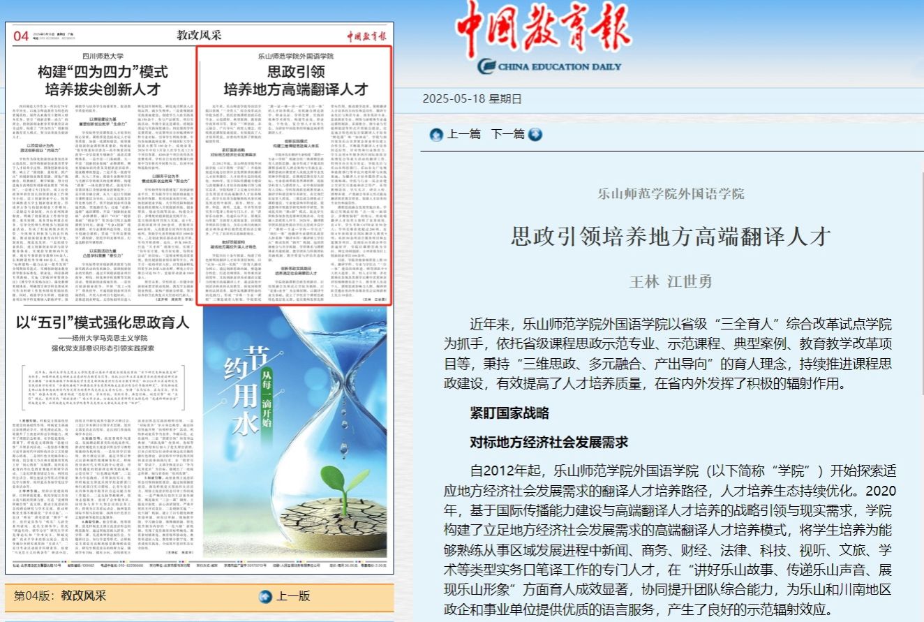 本网讯(文、图/王林)5月18日,《中国教育报》以“乐山师范学院外国语学院思政引领培养地方高端翻译人才”为题,对我校外国语学院地方高端翻译人才培养实践进行了深入报道。