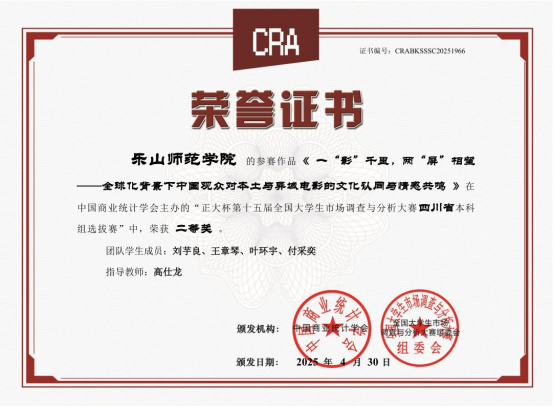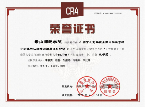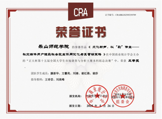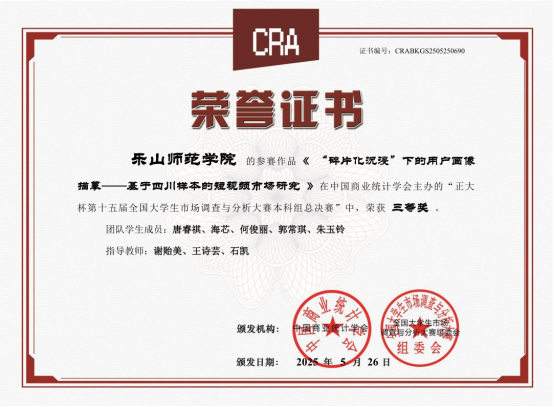 本网讯(文/石凯、图/王诗芸)2025年5月底,由中国商业统计学会主办的“正大杯”第十五届全国大学生市场调查与分析大赛本科组总决赛落下帷幕。本届大赛自2024年9月启动以来,经过知识赛、校赛和省赛的层层选拔,最终共有273支本科生参赛团队进入全国总决赛。乐山师范学院代表队在数理学院的组织安排下表现优异,继去年第十四届首次获得1项国赛三等奖后再创佳绩,本次比赛获得了3个国赛三等奖、1个省赛二等奖和1个省赛三等奖,在省内同类院校中名列前茅。其中,获得国赛三等奖的团队为王诗芸、谢贻美、余孟玲担任第一指导教师,滕新华、唐睿祺、王玉红等同学组队,参赛题目分别为《文化新声,以“剧”传益—媒体用户短剧社会效益协同优化与其营销策略》、《“碎片化沉浸”下的用户画像描摹—基于四川样本的短视频市场研究》、《数字经济时代大学生在线学习消费行为及偏好研究》。
