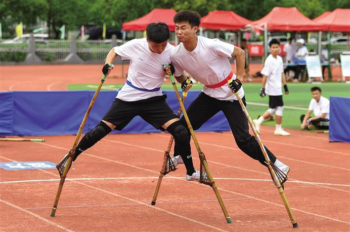 本次比赛分男子个人对抗和女子个人对抗两个组别,男女组分别设5个级别,采用单败淘汰制。比赛过程中,比赛过程中,田径场化身热血战场。运动员踩着竹制高脚杆,如离地的“战马”般腾跃驰骋。有的以灵活变向突破防线,有的凭借稳健下盘频频格挡,或双手紧握护具,身体随高脚杆的晃动保持平衡,每一次肩部撞击都让竹杆震颤不已。现场观众的呐喊声与竹杆碰撞的“咚咚”声此起彼伏,场面十分精彩。运动员、教练员将各项战术发挥到极致。“扫他”“撞他”,候赛的运动员也化身啦啦队,为选手加油鼓劲。