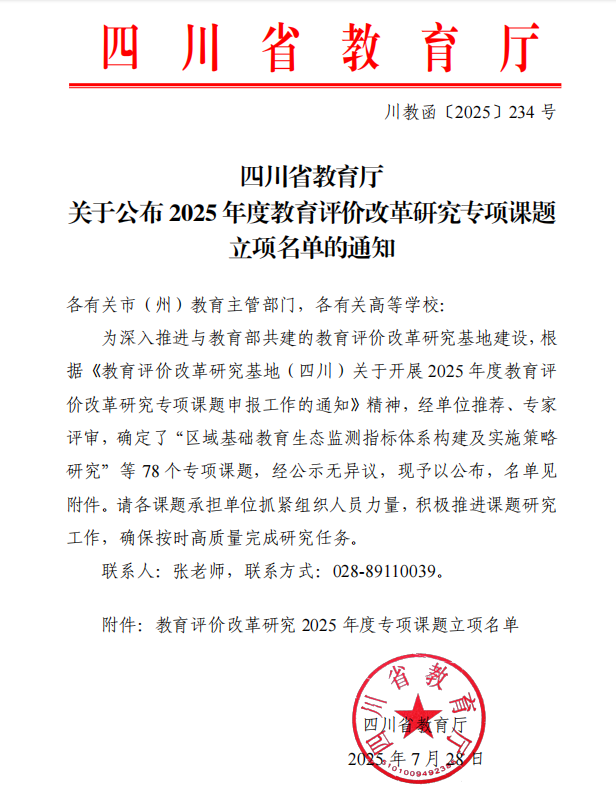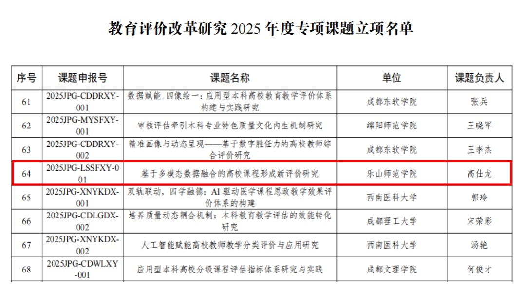 本网讯(文/高仕龙、图/杨玉箫)近日,四川省教育厅发布《关于公布2025年度教育评价改革研究专项课题立项名单的通知》。经单位推荐、专家评审和社会公示等环节,全省共立项78项课题,我校高仕龙教授主持申报的《基于多模态数据融合的高校课程形成性评价研究》位列其中。