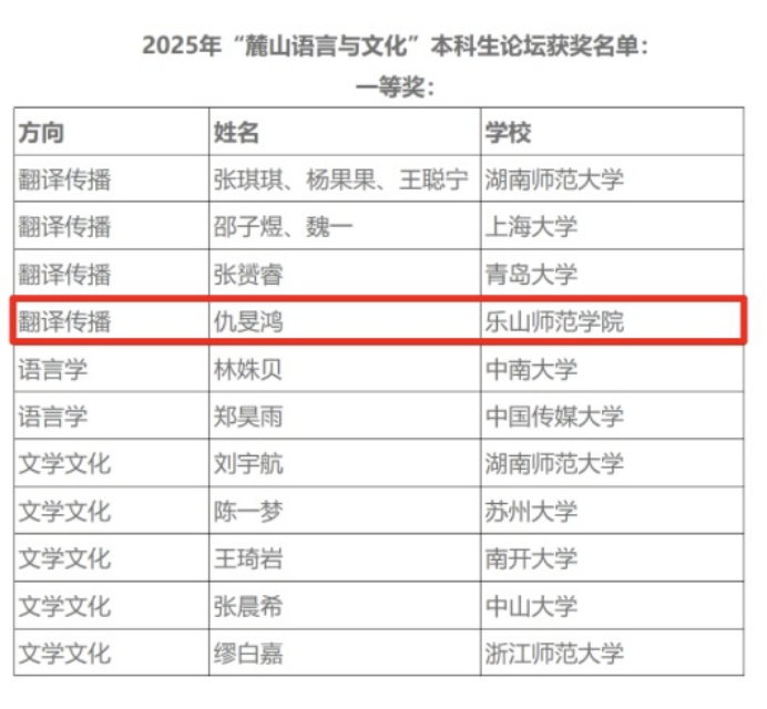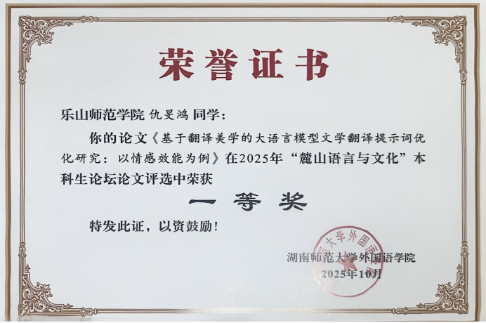 本网讯(文、图 仇旻鸿)10月25日,2025年湖南师范大学“麓山语言与文化”本科生论坛在湖南师范大学外国语学院举行。我校外国语学院翻译专业2022级学生仇旻鸿在导师王林副教授的指导下,撰写论文并投稿,获得翻译传播方向议题一等奖,并受邀参加论坛宣读成果。