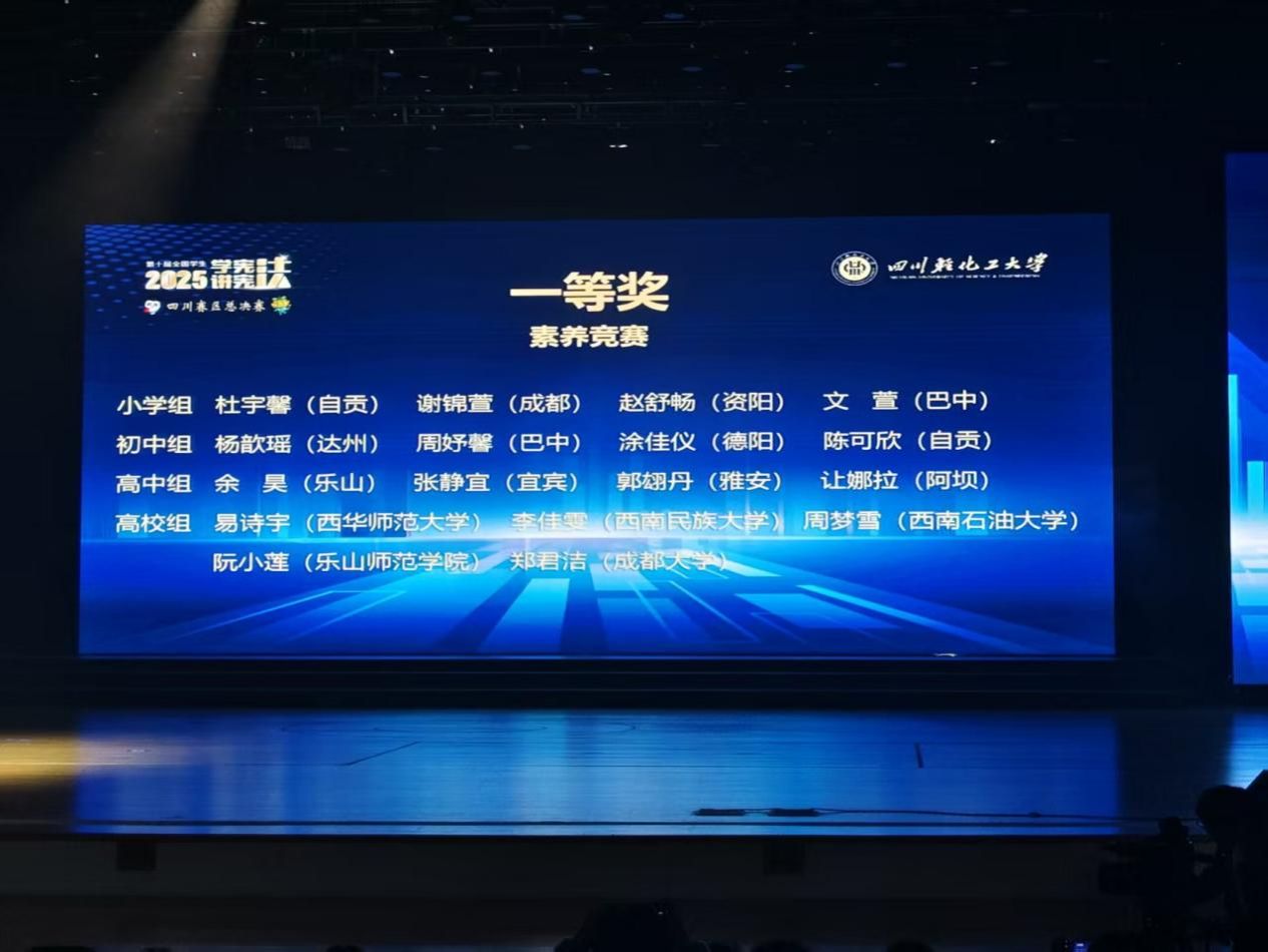 此次素养竞赛覆盖小学、初中、高中及高校四个组别,构建了多元考察体系。竞赛内容既聚焦宪法基本原则与核心要义,又延伸至民法典、未成年人保护法、预防未成年人犯罪法等重点法律法规,全面考察了选手的法治知识储备、法律逻辑思维与实践应用能力。决赛中,阮小莲凭借扎实的法律功底、沉着冷静的临场应变与深刻的法治认知,在多轮激烈角逐中脱颖而出,最终将四川省一等奖收入囊中。
