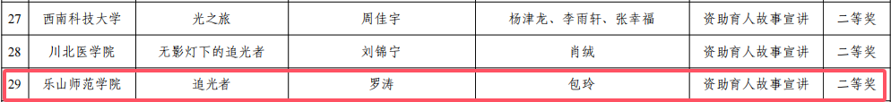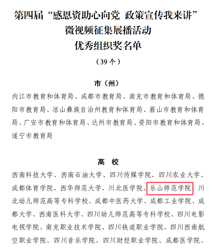 本网讯(文、图/潘红)近日,四川省教育厅公布第四届“感恩资助心向党 政策宣传我来讲”微视频征集活动获奖名单。我校荣获“优秀组织奖”,报送的三个作品获高校组二等奖1项、三等奖1项、优秀奖1项。