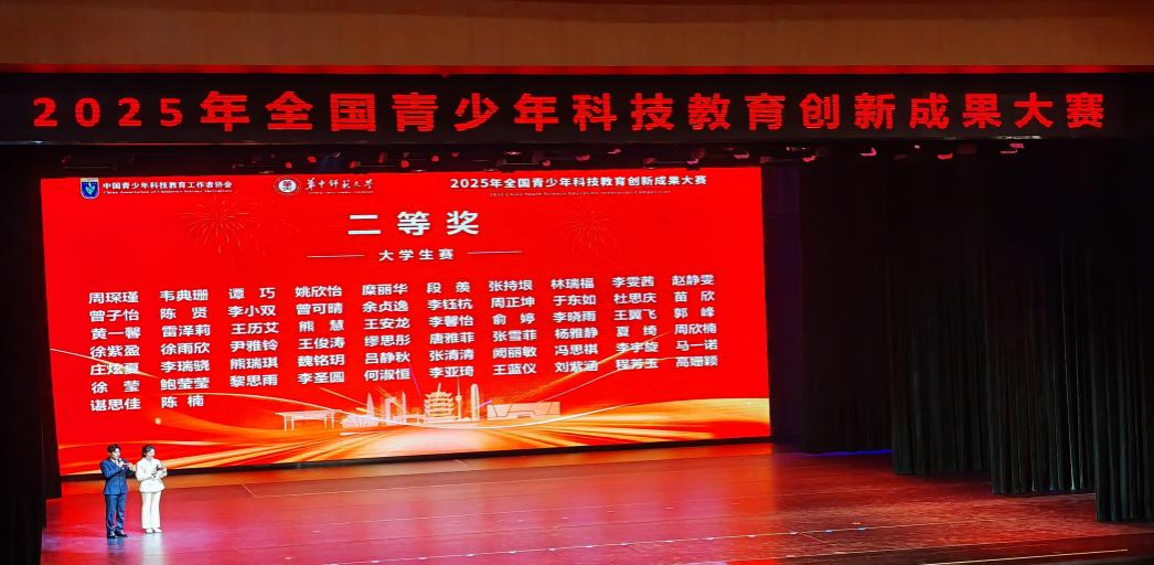 本网讯(文、图/叶超)近日,由中国青少年科技教育工作者协会主办,协会科学教师教育专委会、华中师范大学及《中国科技教育》杂志社承办,中国科技发展基金会、湖北省科学技术协会及格科微电子(上海)有限公司等单位提供资金和技术支持的“2025年全国青少年科技教育创新成果大赛”全国总决赛在华中师范大学落下帷幕。我校生命科学学院学子在王昭君老师、叶超老师及张旭梅老师的指导下,由叶超老师带队,在该总决赛的“大学生赛道”中斩获二等奖2项、三等奖1项。
