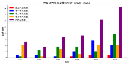 在本次竞赛中,经过四川省数学建模组委会初评与全国数学建模组委会复评,最终我校获得国家二等奖2项、10项省级一等奖、19项省级二等奖和10项省级三等奖,累计获奖41项。相比于2024年成绩,我校省级以上奖项增加了10项,彰显了我校学生扎实数学理论功底和良好的团队协助和创新能力;在川内20余所同层次高校中名列前茅,缩短了与川内985、211等知名高校的成绩差距;较过去5年成绩,我校获奖质量和数量持续稳步提升。