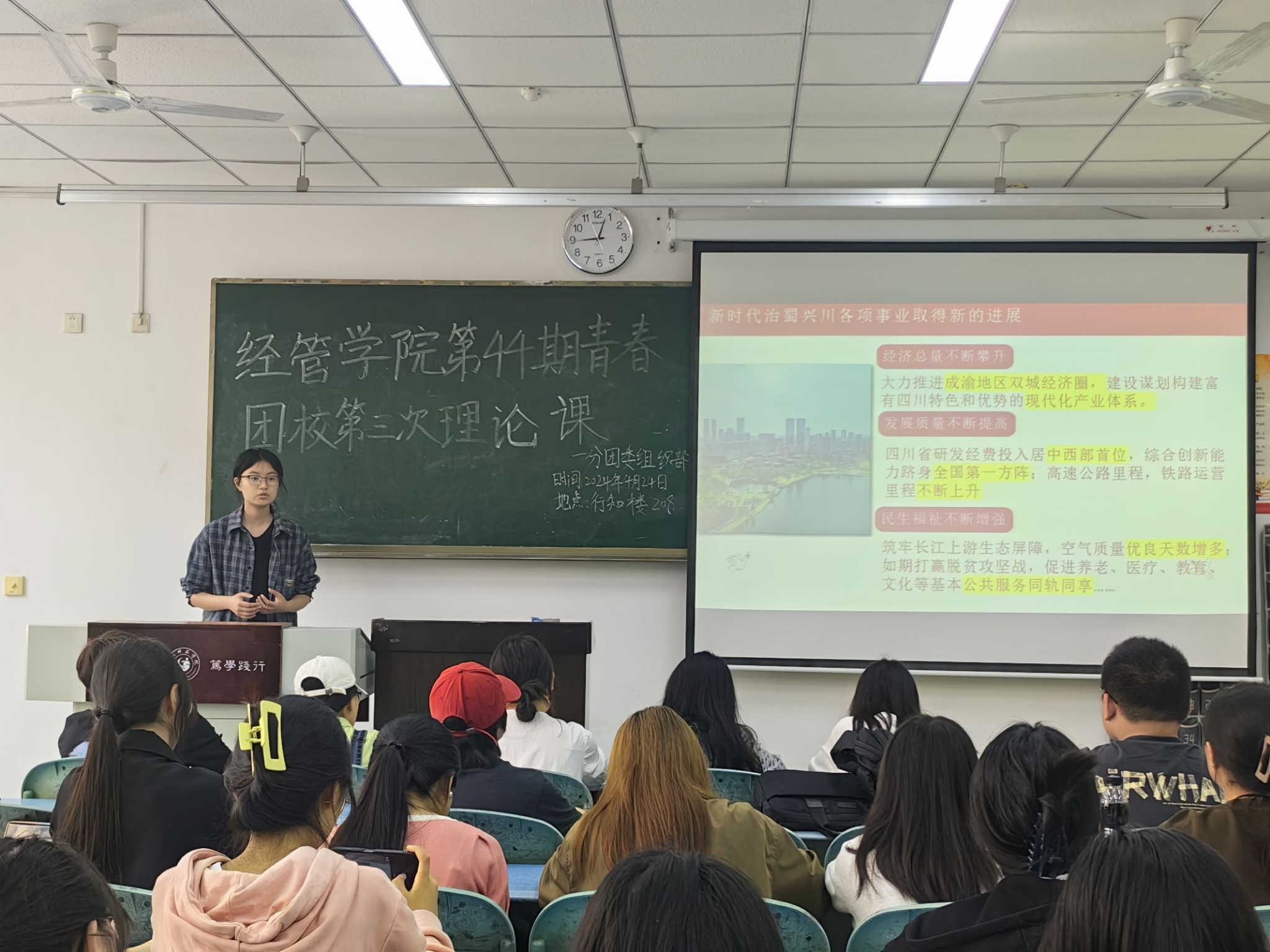 活动初始,学员们佩戴团徽,整齐落座,迎接团旗,齐唱团歌。随后,“红帆”宣讲团向学员们全面剖析了中国经济的发展脉络和现状,深入解读了当前国内外经济形势下的机遇与挑战,强调了城乡融合、乡村振兴对于推动经济社会发展的关键作用,让学员们直观感受到了中国经济的蓬勃活力和巨大潜力,同时增强了学员们对中国经济的信心。