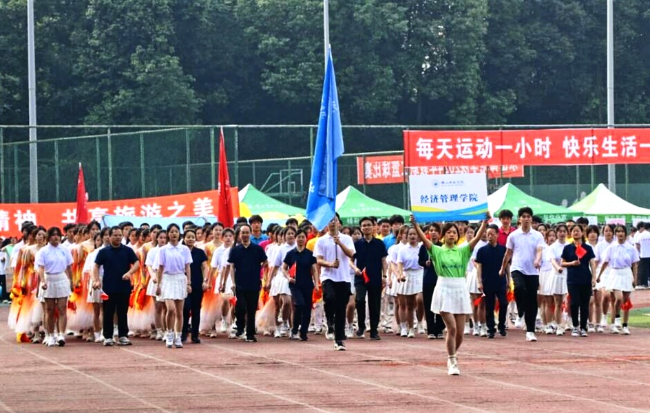 25日上午8点30分,运动会开幕式开始。经济管理学院党委书记郭晓黎,党委副书记、纪委书记丁敏娜,副院长罗富民、吴耀国等8名教师带领经管学院代表方队,以整齐划一的步伐,精神抖擞地走向主席台。他们喊着“经世济民,互利共赢,精益求精,属我最行”的响亮口号,在背景音乐下,以朝气蓬勃的身姿、充满活力的精神面貌进行方阵表演,展现出经济管理学院青年人意气风发的活力。