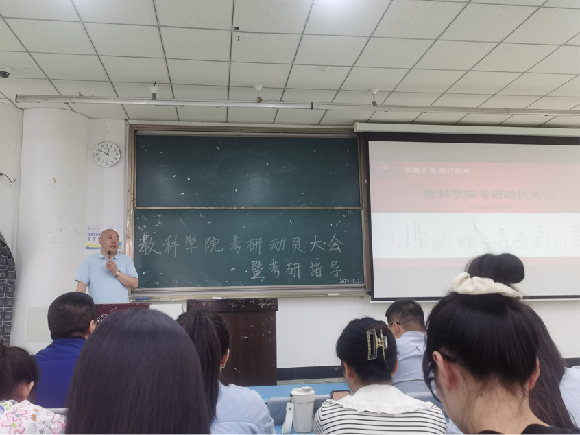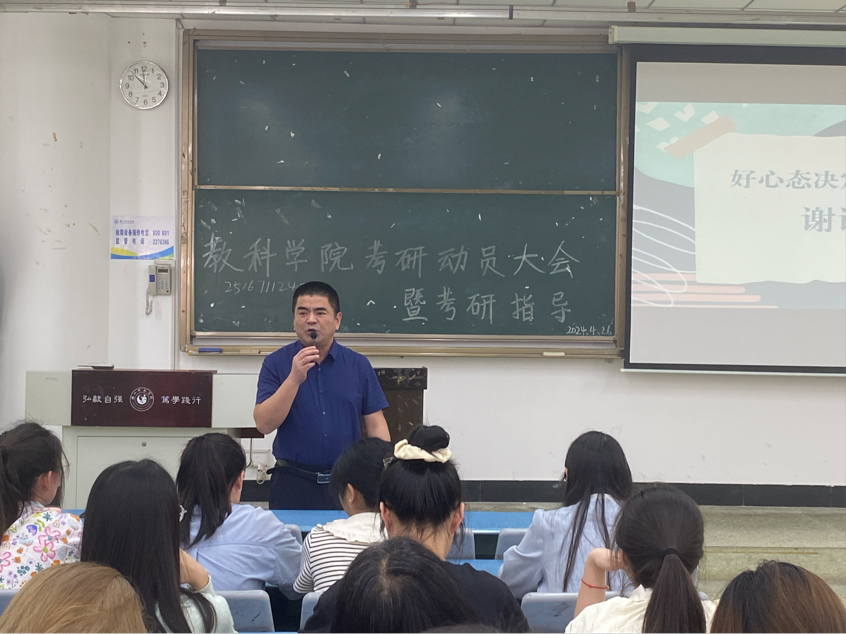 本网讯(文/朱梓菡 图/徐思捷)4月29日上午,教育科学学院于行知楼114召开了2025届考研学生动员会。学院党委书记罗立顺、学院党委副书记何晓军、2021级辅导员张源元、2024届考研录取学生代表出席,2021级全体有考研意向的同学参加。