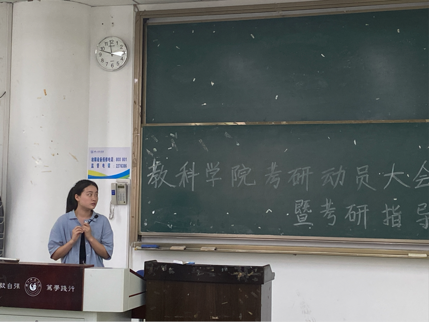 接着,六位考研已录取的优秀学生向大家分享了自己的备考方法和心得体会。考入西北师范大学课程与教学论专业的余倩同学着重向同学们介绍了调剂与选择学校的方法和技巧,她以亲身经历讲述了考研择校的重要性,选择备考学校一定要与自身的能力相匹配,目标定位过高会带来极大的精神压力和焦虑感,且容易备考失败。在调剂时,一定要提前与目标院校取得联系,了解调剂要求,且心理上不要受地域的限制,抱着“能走就走”的心态,珍惜每一个调剂机会;考入贵州师范大学学前教育专业的彭赢分享了自己的英语复习方法,她表示:“单词是王道,坚持就会成功。”并向大家分享了自己感觉好用的网课平台和备考资料,鼓励同学们调整备考心态,希望大家能考出理想成绩;考入大理大学学前教育专业的胡天艺分享了专业课的复习技巧,她告诉同学们:“要制定好专业理论学习计划,强调注重学习效率,将考研复习生活化”;考入四川师范大学心理学专业的石惊鸿、巫优泓强调备考要规划好每一个时间点,一定要把握当下,坚持不懈,奔向成功;考入四川师范大学科学与技术教育专业的陈梦婷介绍了考研政治的备考思路,她指出考研政治学习不要操之过急,理解为主,背诵为辅,要多关注国家的时事政治;考入重庆师范大学科学与技术教育专业的贾子淇向同学们分享了考研中支持她的动力,并分享了考研过程中她走过的“弯路”,希望她的经验能够陪伴同学们更加顺利的走过考研之路。分享结束后,同学们自由提问,就考研备考中自己所产生的疑问向老师和学姐提问,大家交流热烈。