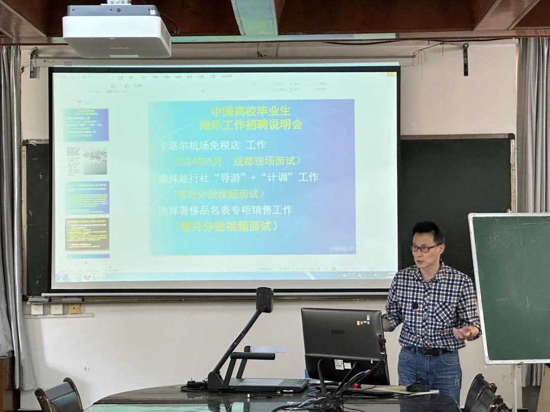 本网讯(文图/侯怡旭)近日,旅游与地理科学学院邀请成都国际公司总经理陈晓明在旅院楼102教室为学院旅游管理和酒店管理专业学生开展境外实习就业招聘宣讲。