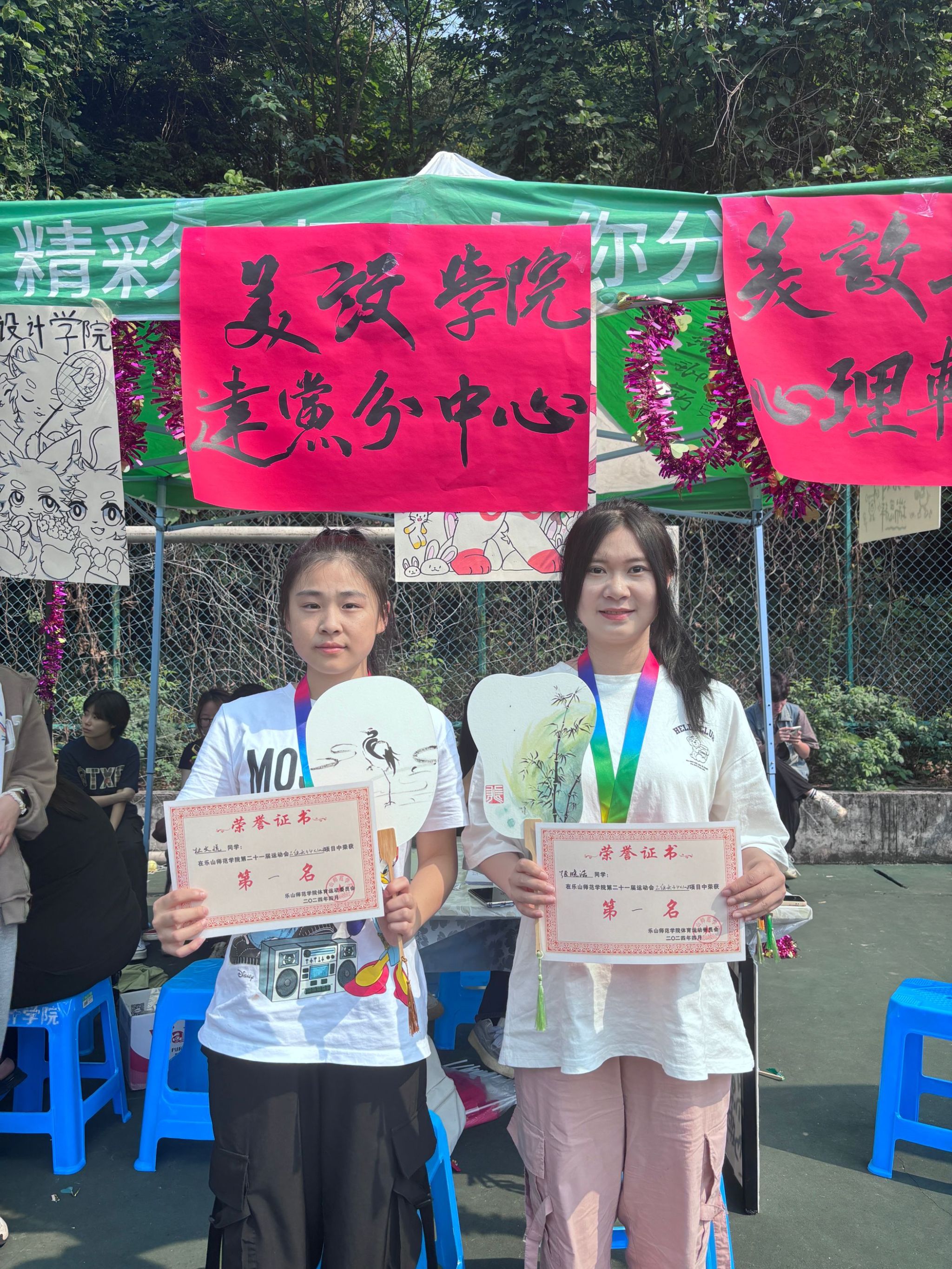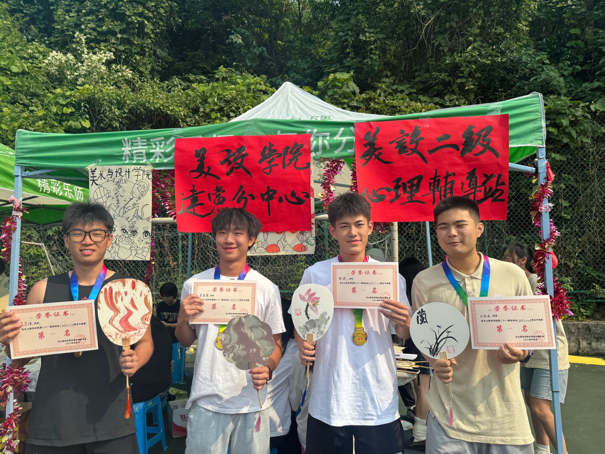 本网讯(文图/孙若菡)4月25日、26日,学校第二十一届春季运动会举办期间,美设学院党建分中心联合二级心理辅导站开展学生党员送清凉活动,为各项比赛获得第一名的运动员现场书画专属宫扇、制作漆扇。
