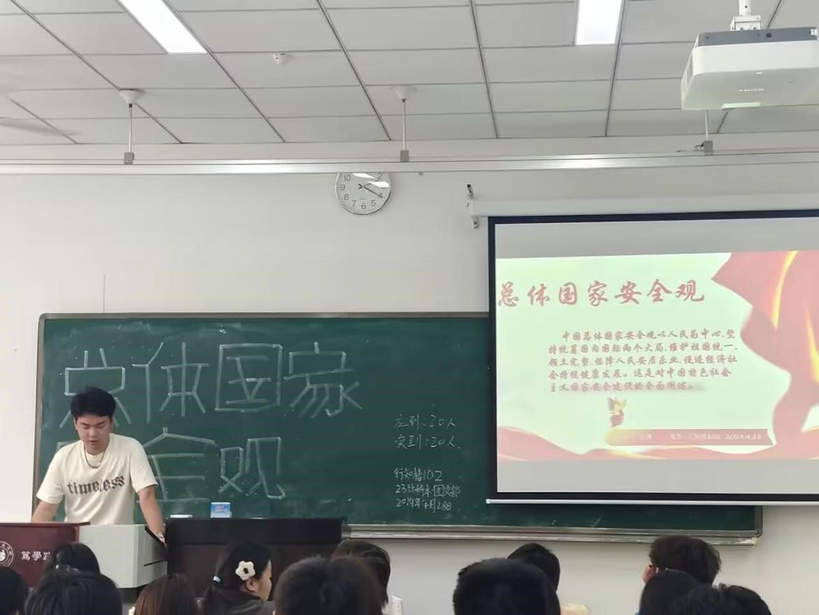 团课开始,迎团旗,唱团歌。各个班级的团支书通过深入浅出地讲解,让同学们深刻理解总体国家安全观的内涵和意义。团课内容涵盖了国家安全的基本概念、总体国家安全观的内涵、国家安全形势分析等方面,引导同学们全面了解国家安全的重要性和复杂性。在团课中,团支书通过生动的案例分析让同学们深刻认识到国家安全不仅是国家层面的事情,更是每个公民的责任和义务。他们强调了同学们在维护国家安全中的重要作用,鼓励同学们积极参与国家安全教育和实践活动,增强自身的国家安全意识和能力。