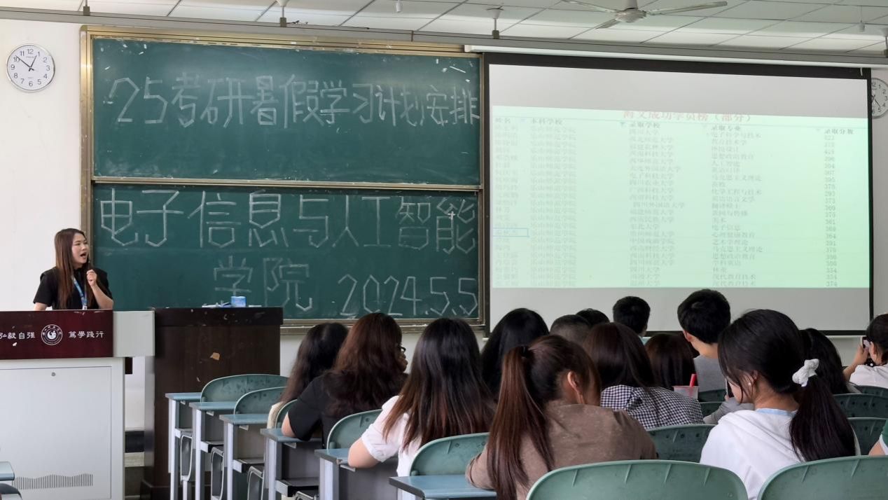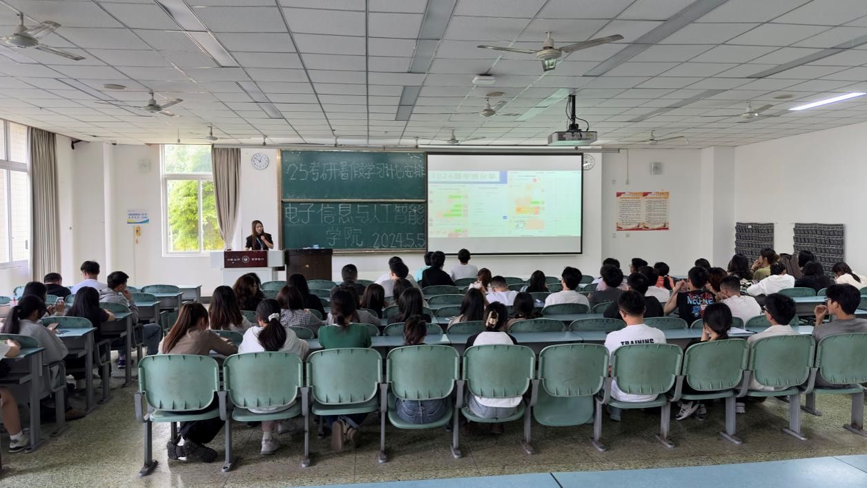 本网讯(文/张宇昊、图/官辉)为全面提升25届考研学生的备考基础,提前促使考研学生养成科学合理的考研学习节奏,5月5日,电子信息与人工智能学院在行知楼101召开25届考研学生暑假规划指导大会。本次会议邀请到的主讲老师是来自万学海文考研的王美伊老师,电子信息与人工智能学院全体25届考研学生共同参与。