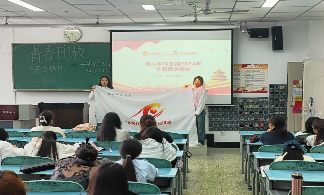 宣讲团成员向音乐学院、美术与设计学院、文学与新闻学院进行了2024年全国“两会”精神宣讲。宣讲团成员主要从两会的基本概述、会议上对2023年政府的工作回顾、2024年经济社会发展总体要求和政策取向以及2024年的政府工作任务进行宣讲。同时,宣讲团成员向同学们详细讲述了习近平总书记在两会上着重解释的新质生产力,并表示希望同学们能够在新时代以个人之力助力新质生产力的发展。
